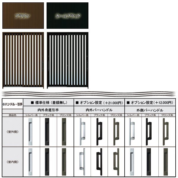 | ■ ハンドル仕様 | ■内外舟底引手 室外側:引手/室内側:引手 (基本仕様) 追加差額無し ------------------------------------------------------------------------- ■外側バーハンドル 室外側:バーハンドル/室内側:引手 (+12,000円) ■内外バーハンドル … 室外側:バーハンドル/室内側:バーハンドル (+21,000円) |