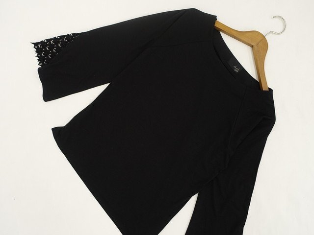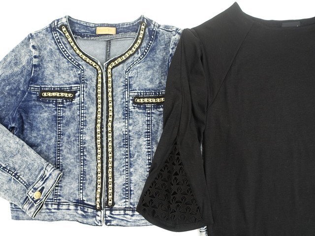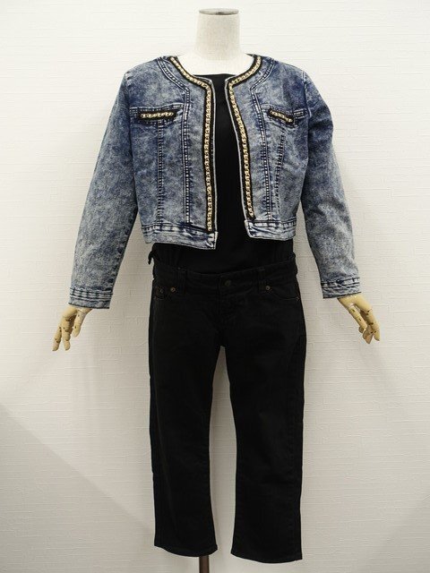 洗える長袖 デニムノーカラージャケット+長袖カットソー+ノータッククロップドパンツ コーディネート上下3点セット M相当 ブルー×ブラック/ブラック カジュアル
