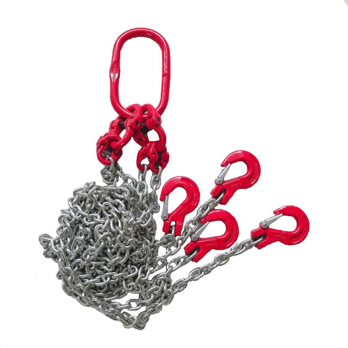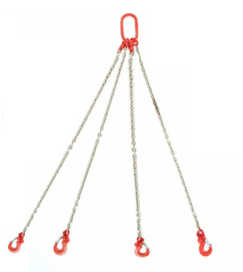 マルチレッグウェビングスリングは、メインリフティングリンク、シャックル、リフティングウェビングスリング、金属製エンドピースで構成されています。 |