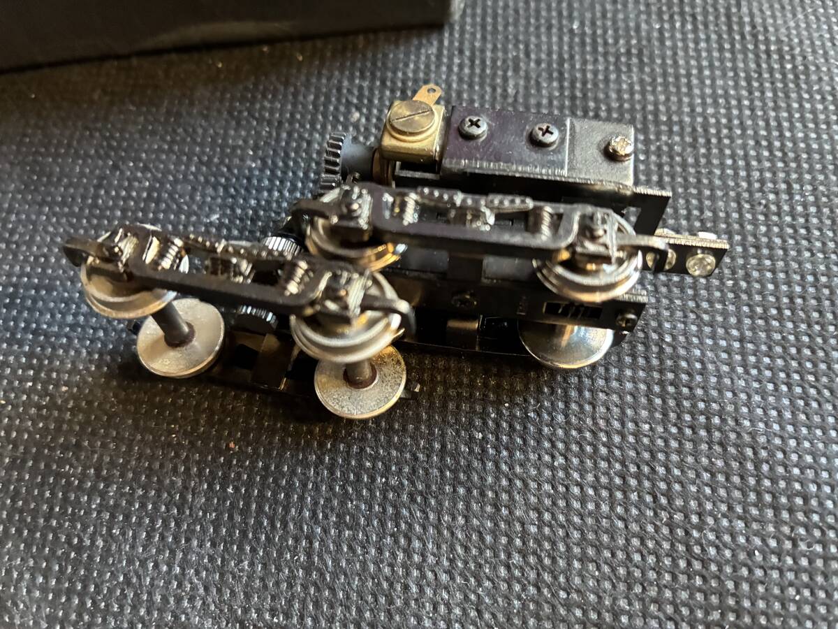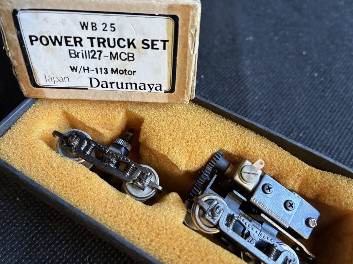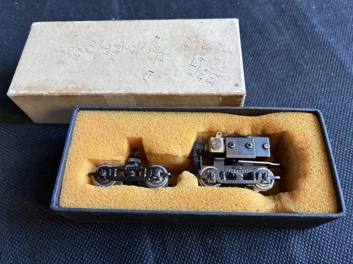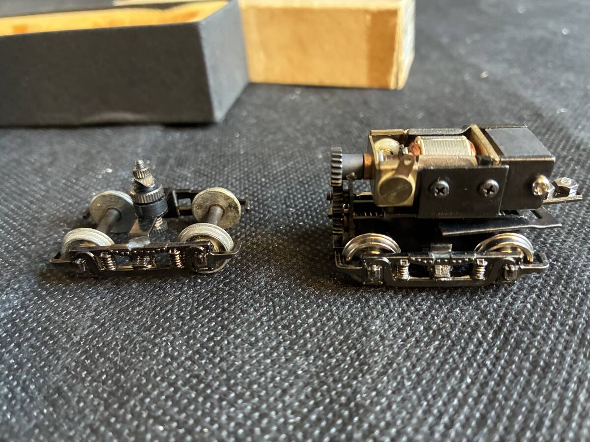 HOゲージのモーター付き台車と車輪です。台車が2つあります。床につけられるようになっています。昔「だるまや」で発売した古典電車の分売パーツです。配線し集電すれば動きます。台車はブリル台車で表示には「Brill27-MCB」とあります。またWB25と書いてますので、ホイールベースが25mmです。モーターの種類として「W/H-113Motor」とあります。現在のパワートラックの一時代前のパワートラックです。今では入手困難です。車両工作がお好きな方、またOゲージナローにお使いになる方にはピッタリです。未使用です。NRNCでお願いします。