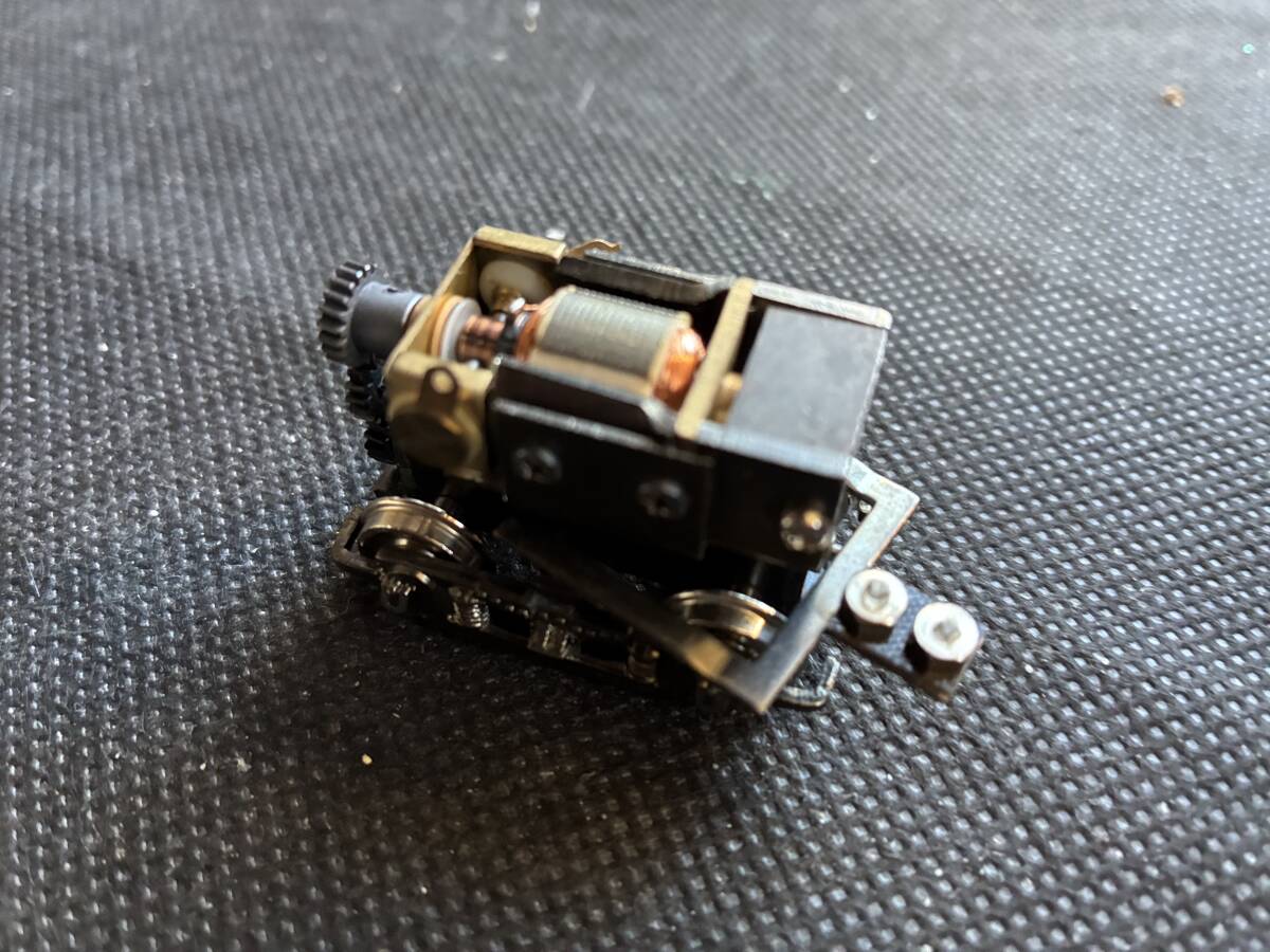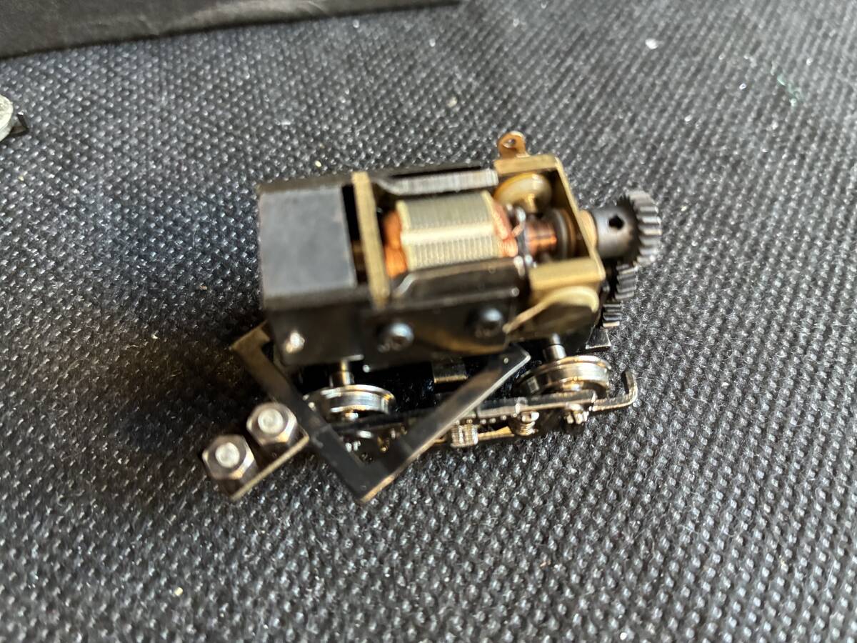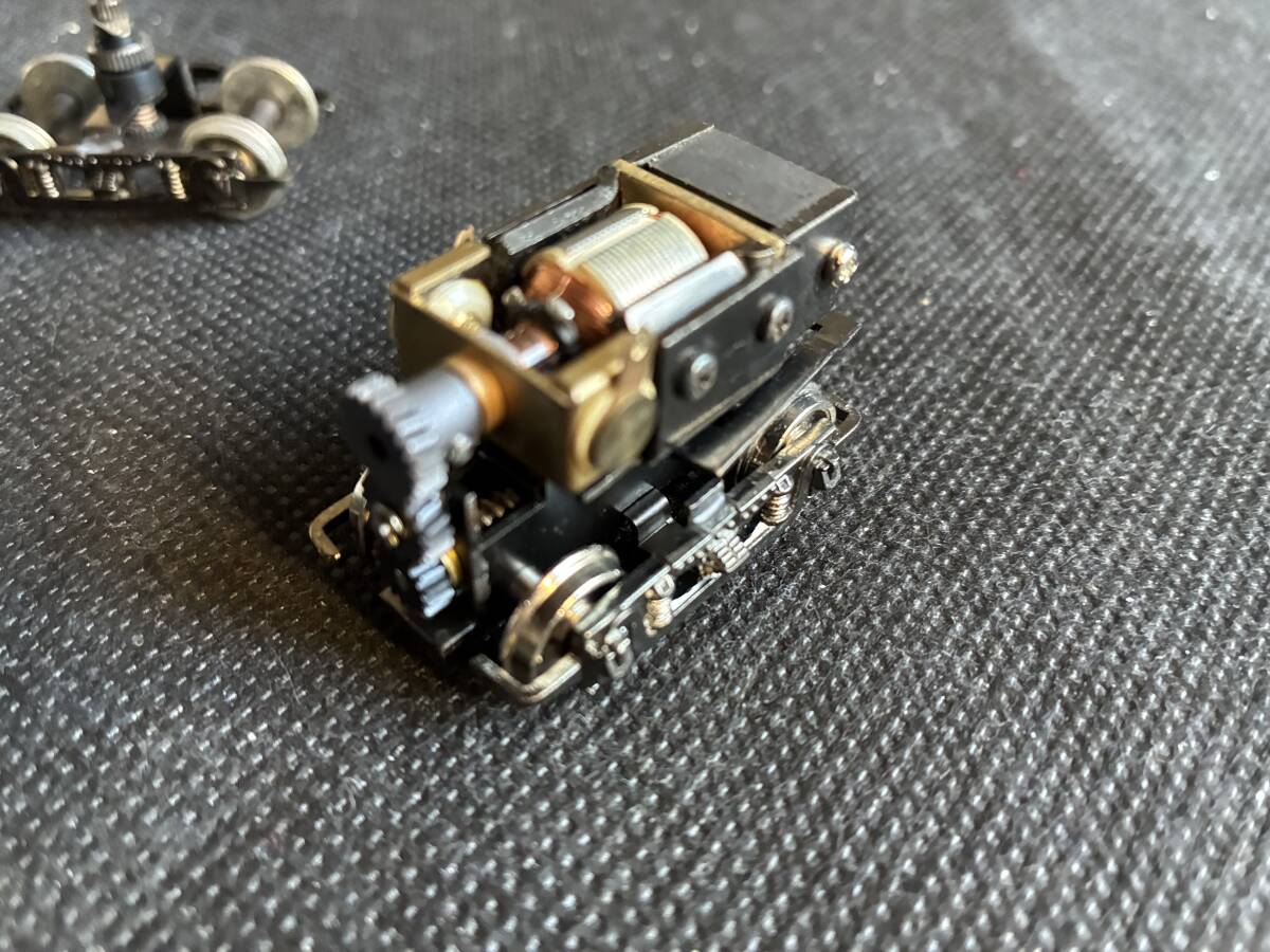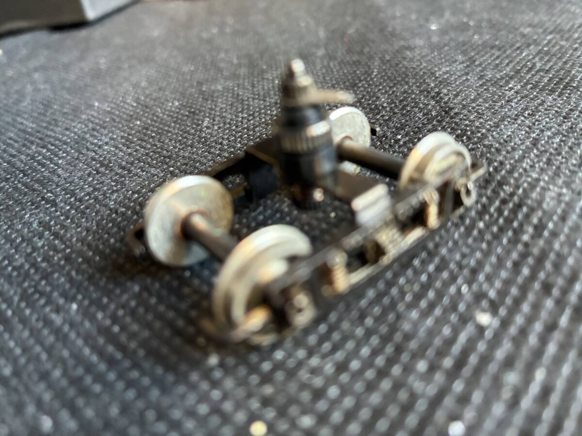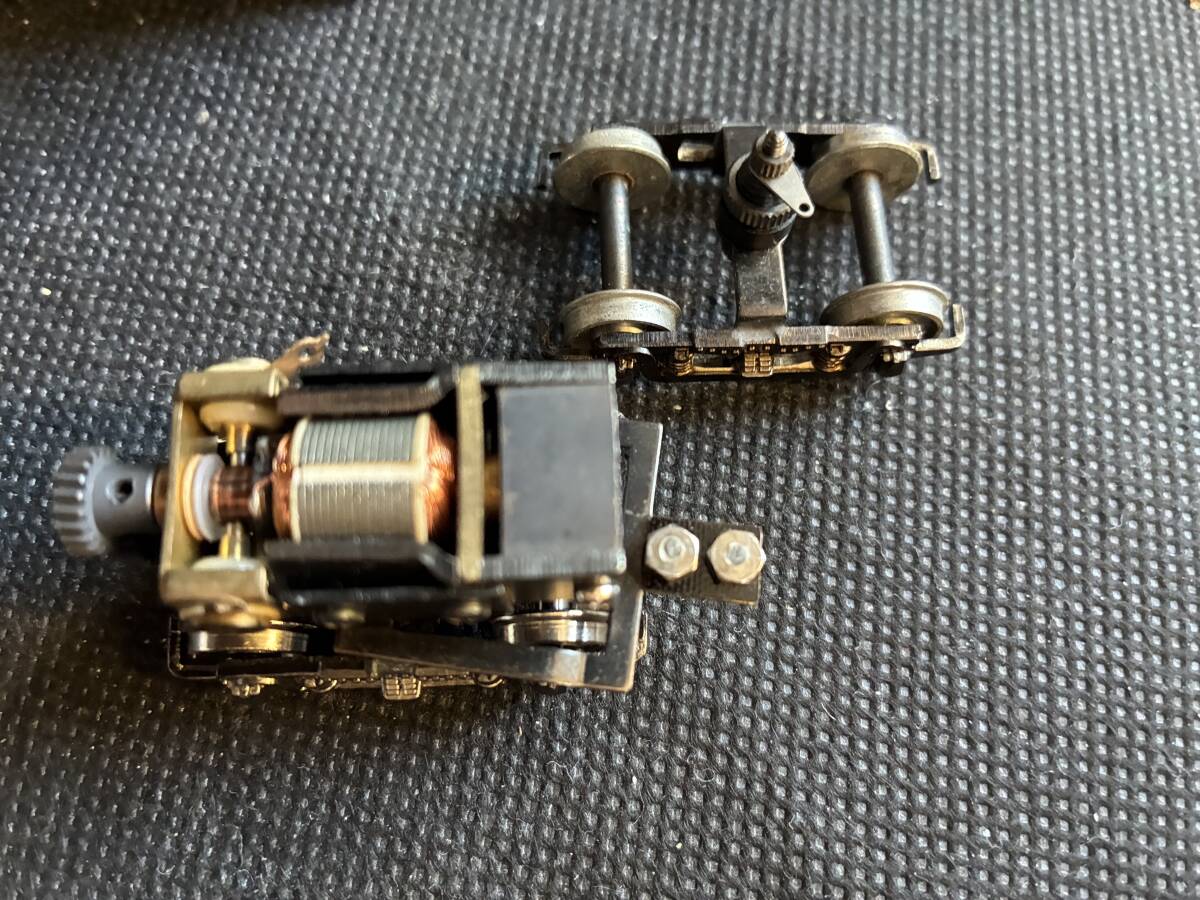 HOゲージのモーター付き台車と車輪です。台車が2つあります。床につけられるようになっています。昔「だるまや」で発売した古典電車の分売パーツです。配線し集電すれば動きます。台車はブリル台車で表示には「Brill27-MCB」とあります。またWB25と書いてますので、ホイールベースが25mmです。モーターの種類として「W/H-113Motor」とあります。現在のパワートラックの一時代前のパワートラックです。今では入手困難です。車両工作がお好きな方、またOゲージナローにお使いになる方にはピッタリです。未使用です。NRNCでお願いします。
