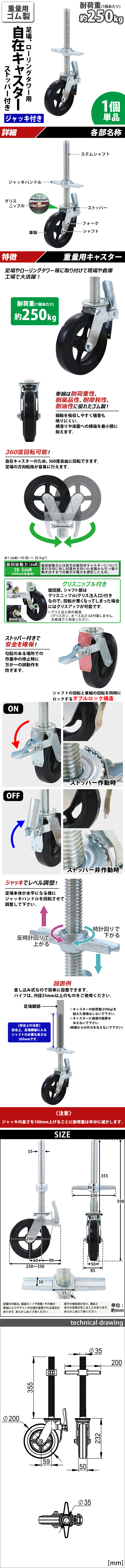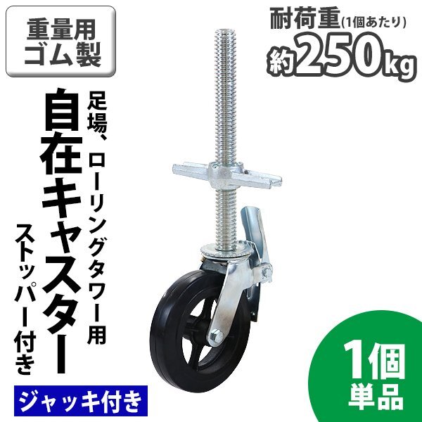 | 商品名 | 送料無料 キャスター 足場キャスター ジャッキキャスター 自在キャスター 重量用 ゴム製 ストッパー付き 1個 単品 耐荷重約250kg(1個あたり) 車輪直径約200mm 幅約50mm 自在車 ゴムキャスター ゴム車輪 ラバー ジャッキ付き ローリングタワー 高さ調整 scacs80rus51r1p |