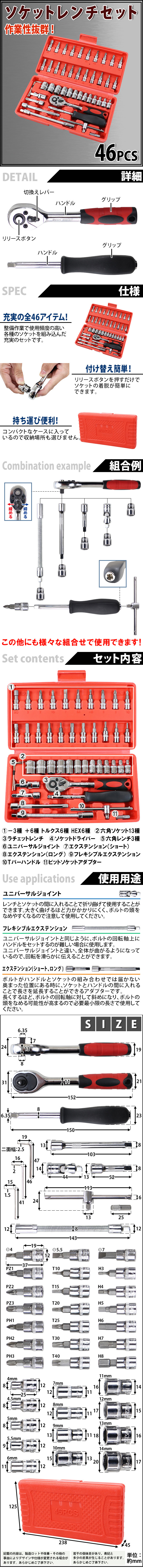 | 商品紹介 | ■充実の全46アイテム! ■ラチェット機構になっているので何度もボルトにレンチを掛けなおす必要がありません! ■手の往復操作だけで作業が出来ます。 ■締付け、緩めは切り替えレバーを左右に切り替えるだけのワンタッチ操作。 ■作業に合わせて様々な組合せで使えます! ■収納、持ち運びに便利なケース付き ■ボルト・ナット・ネジのサイズに合ったものを使用してください。 ■セット内容 差込角:1/4"(6.35mm) ・ソケット33種 ・ラチェットレンチ ・ソケットドライバー ・六角レンチ(1.5mm、2mm、2.5mm) ・ユニバーサルジョイント ・エクステンション(ショート、ロング) ・フレキシブルエクステンション ・Tバーハンドル ・ビットソケットアダプター ■重量:約1.2kg ■材質:炭素鋼、PVC(グリップ)、CRV【クロムバナジウム鋼】(各種ソケット)、プラスチック(ケース) ★1階車上でのお渡しとなります。恐れ入りますが荷降ろし・搬入は、お客様にてお願い致します。 ●新品商品ではありますが、輸入商品の為、多少の擦り傷などがある場合がございますので、ご納得の上ご購入下さいませ。 ●ご購入後、お客様ご都合によるご返品、ご返金等は一切お受け致しておりません。 ●本商品を使用した際に発生したトラブル、事故につきまして、当社は一切の責任を負いません。 ご使用に関しましては、全て自己責任にてお願い致します。 |