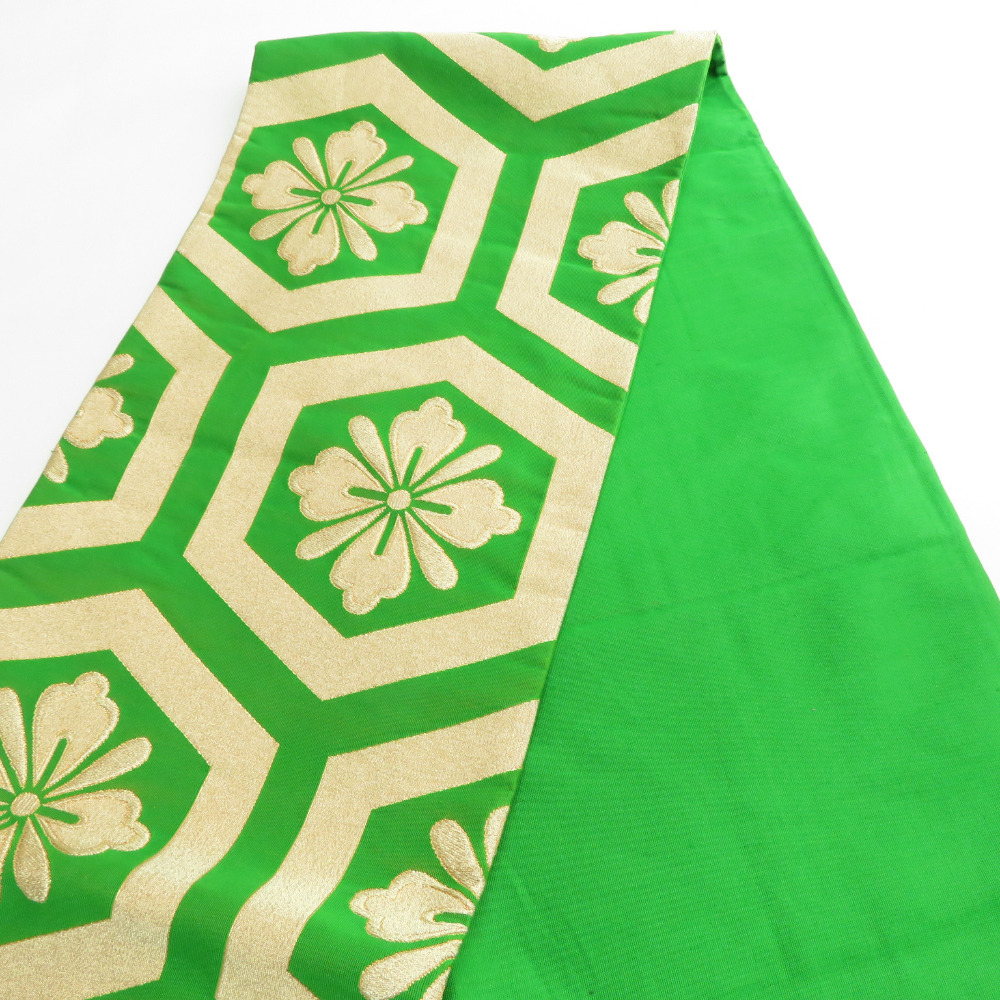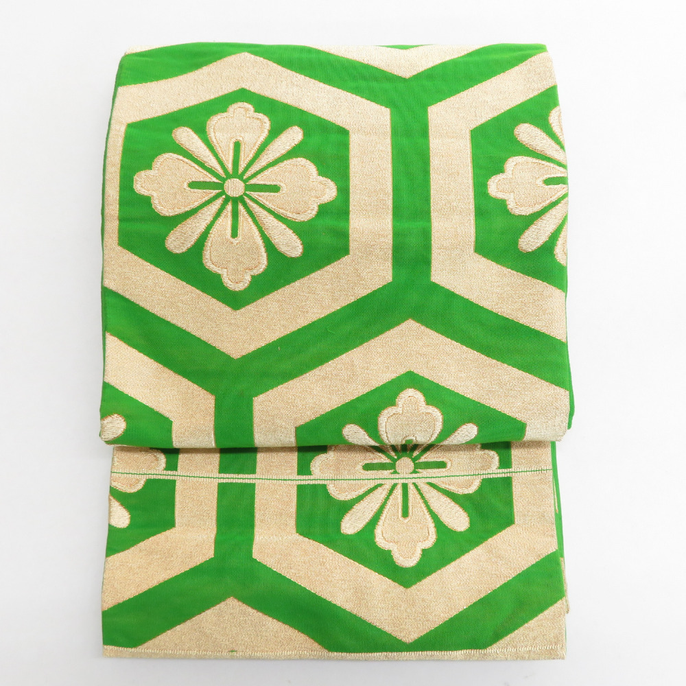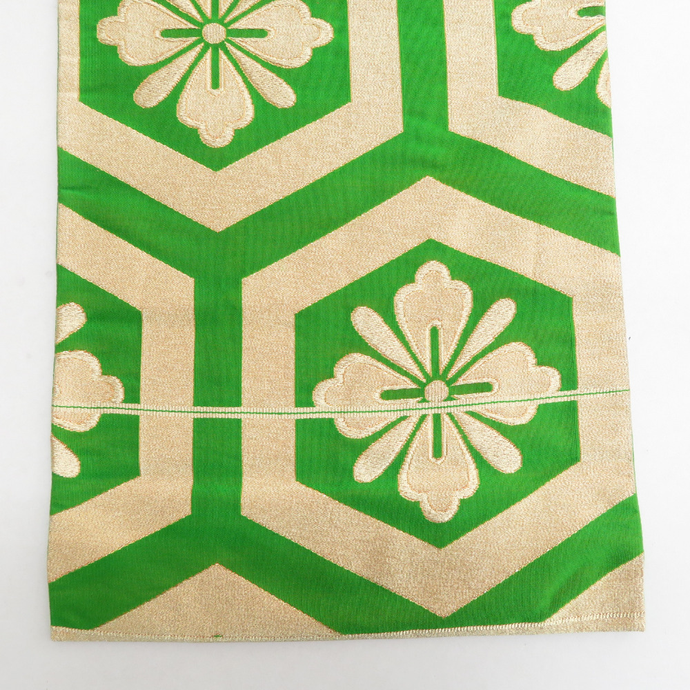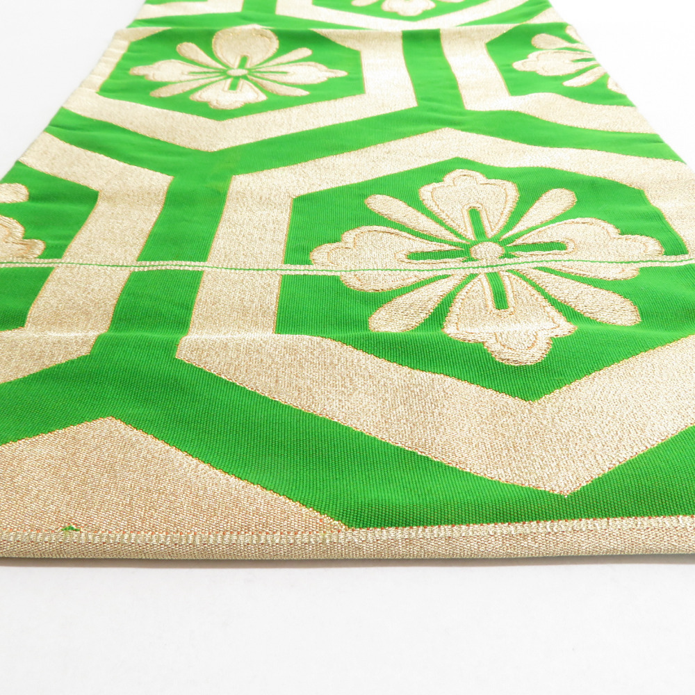 | 袋帯 金糸 グリーン系 緑色x金色 亀甲に菊紋様 六通柄 レトロ 正絹 仕立て上がり 長さ416cm |