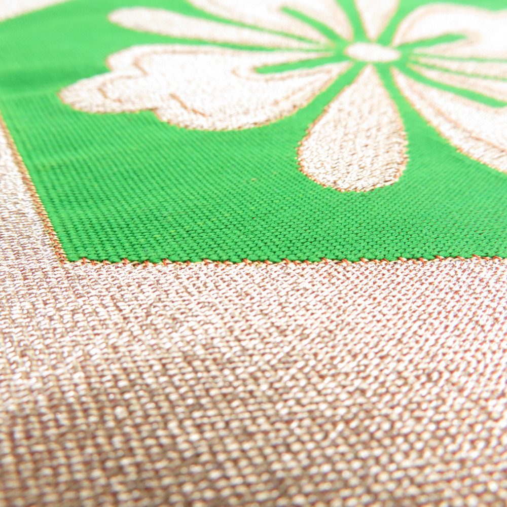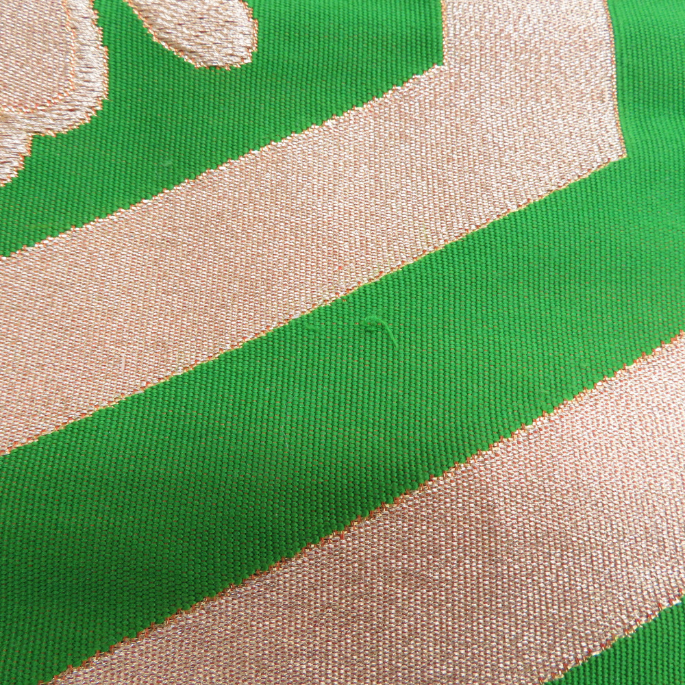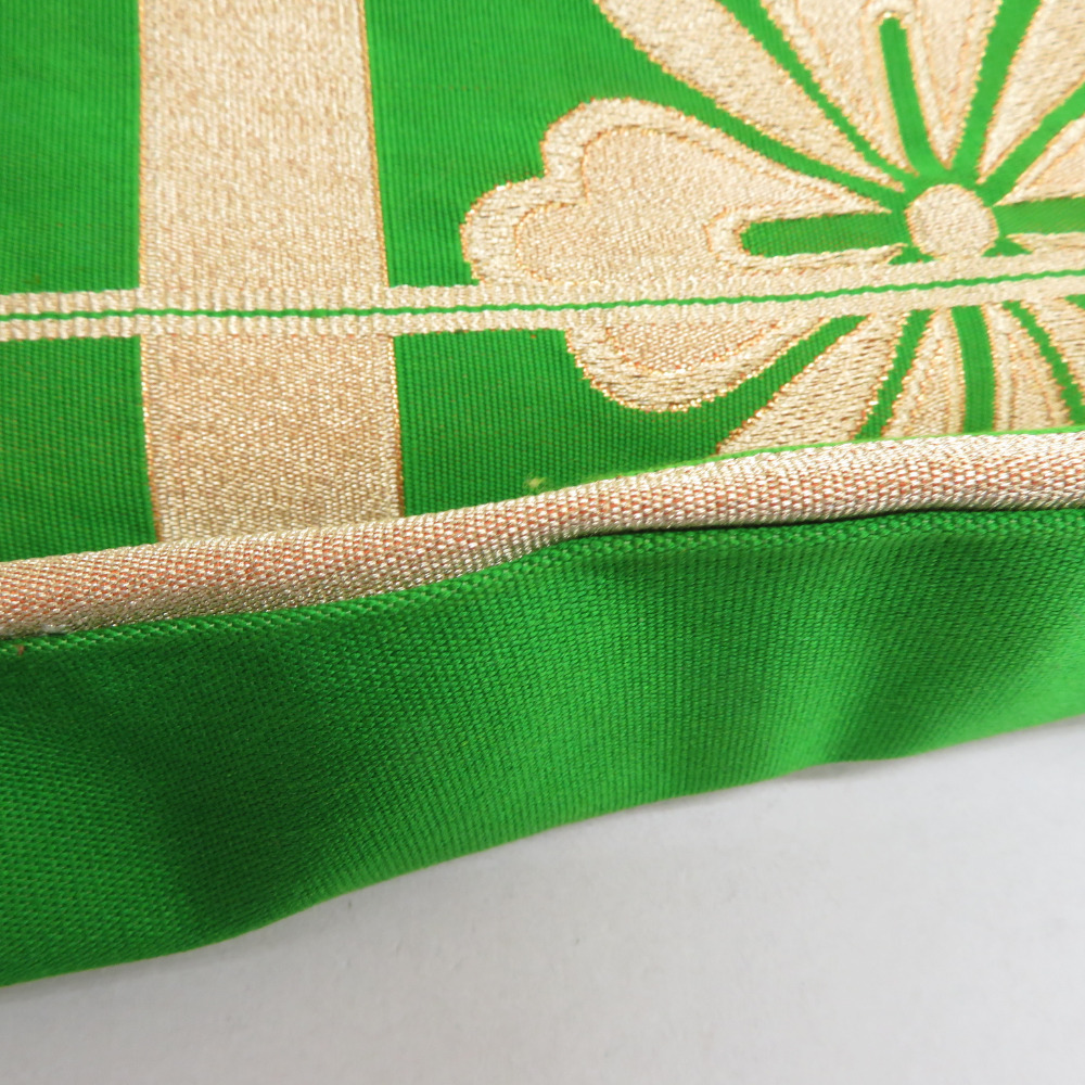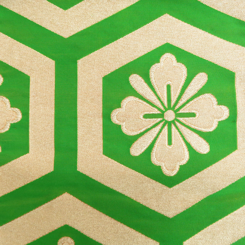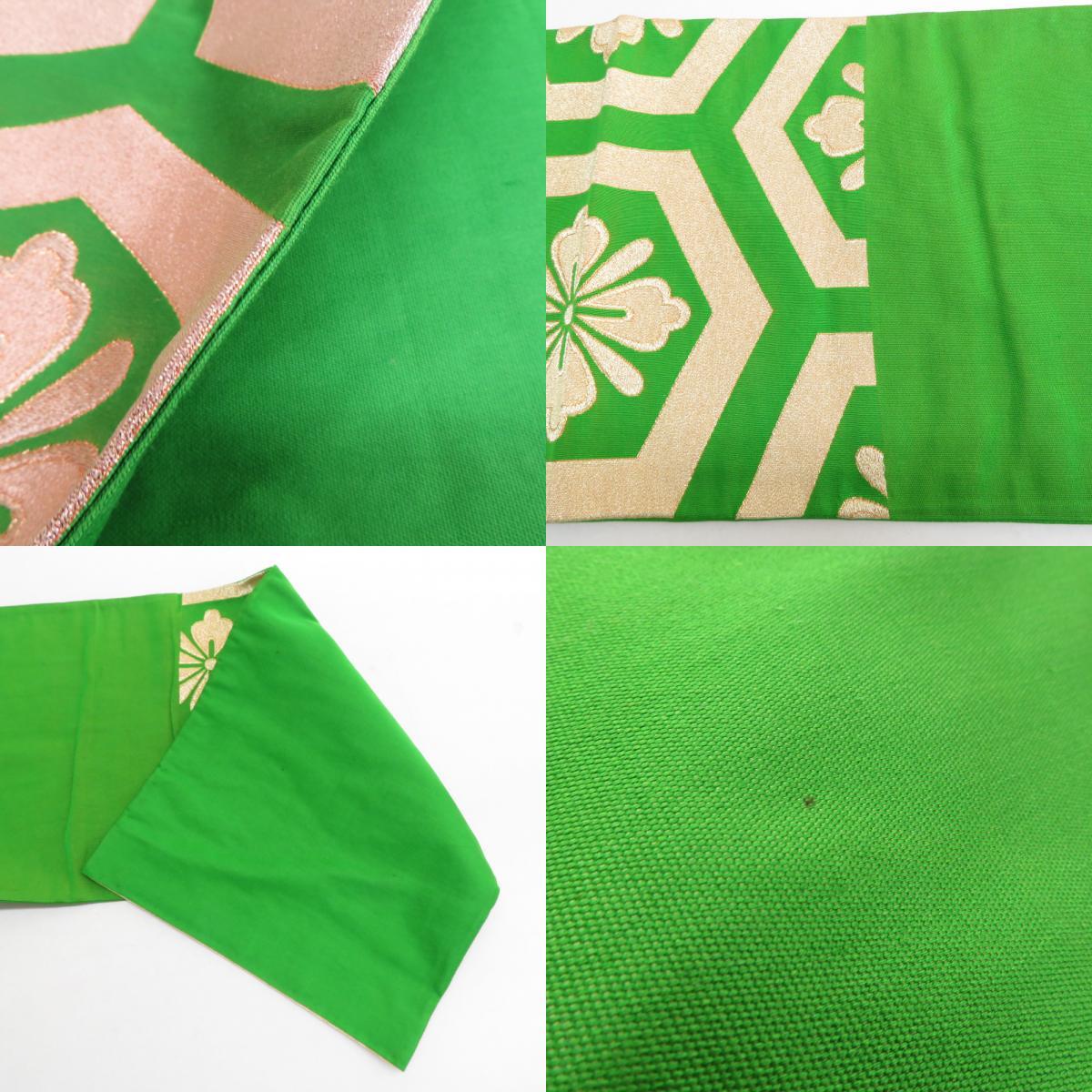 | 袋帯 金糸 グリーン系 緑色x金色 亀甲に菊紋様 六通柄 レトロ 正絹 仕立て上がり 長さ416cm |
