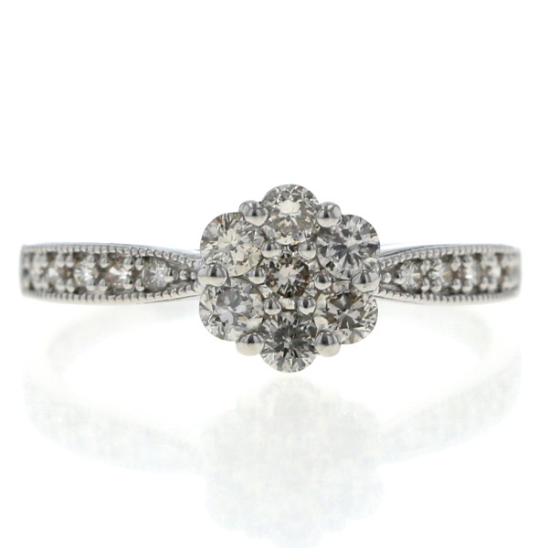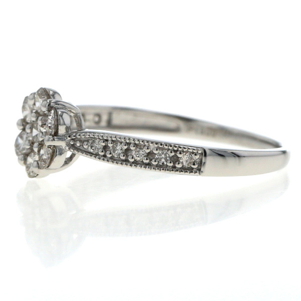 | 商品紹介 | ダイヤモンドを贅沢に敷き詰めたフラワーモチーフが華やかなプラチナリングです。 花びらのように煌めくパヴェダイヤが、指先に優雅な光を纏わせます。中央のモチーフから両脇へと流れるように並ぶダイヤが、上品で立体的な輝きを演出。特別感がありながらも品よくまとまったデザインです。 |