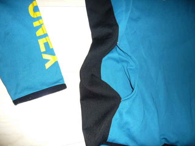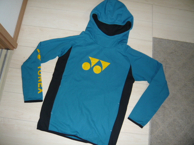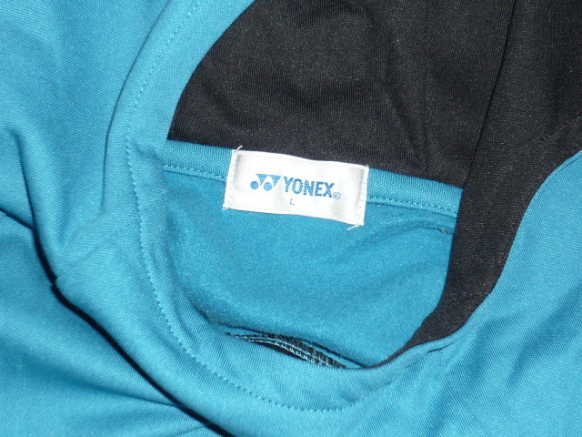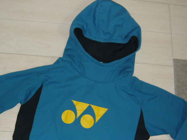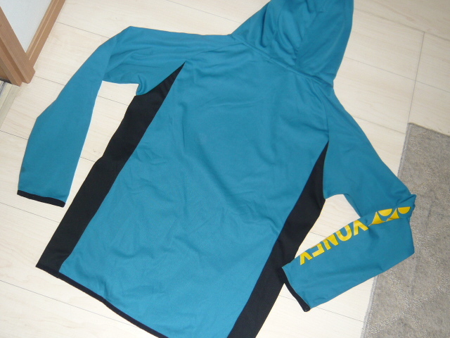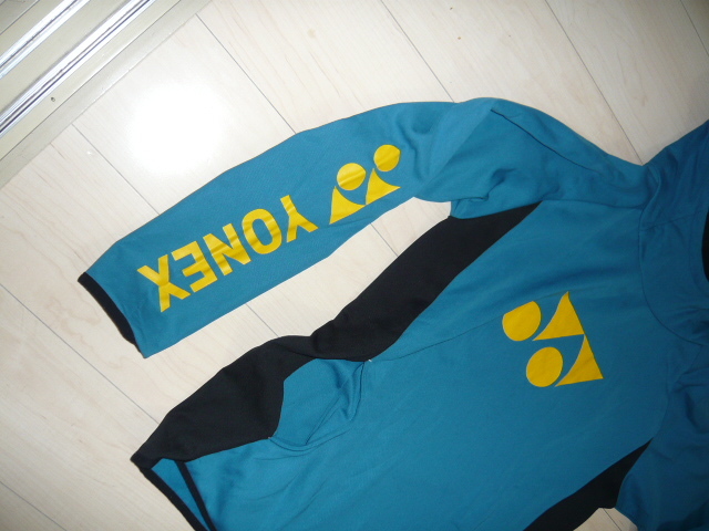 ヨネックス Lサイズ(Mに近い)裏起毛プルオーバーパーカー/ブルゾン 丈長め 右腕ビッグロゴ 濃い目のターコイズブルー系 中古良品
