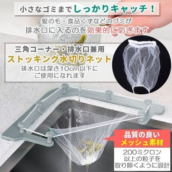 三角コーナー 排水口兼用のストッキング水切りネットです。増量で総合50枚入り、毎日2枚使うと、半月以上使えます。
