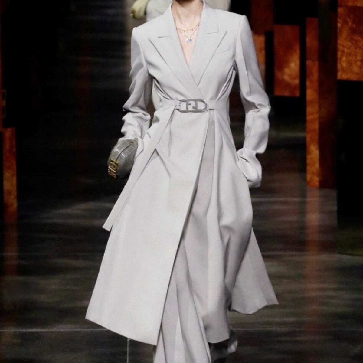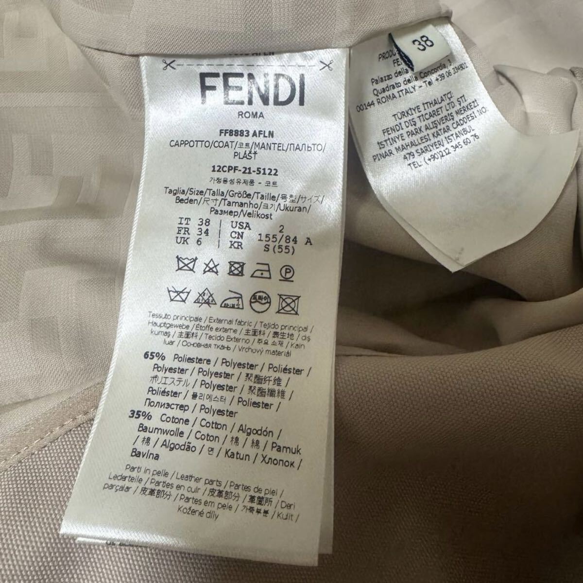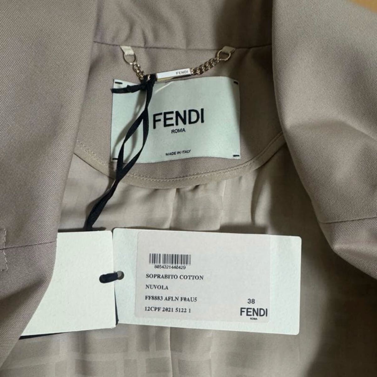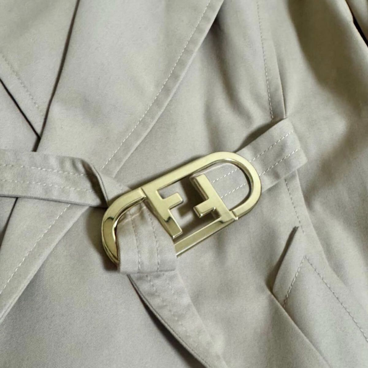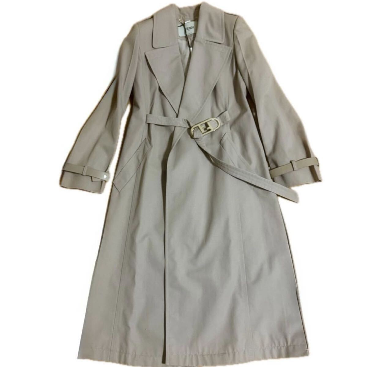 【商品】FFロゴのバックルが目を引く、エレガントなライトベージュのトレンチコート。フェンディらしい上質な素材とシルエットで、パンツにもスカートにも合わせやすい万能アイテムです。ランウェイモデルとして登場した人気デザインで、未使用・半額以下の大変お買い得な一着です。