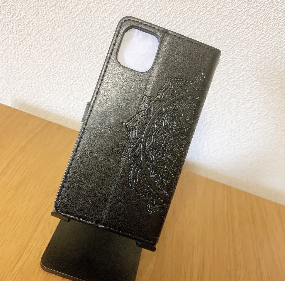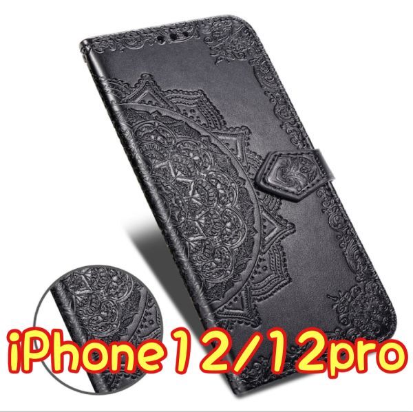 エンボス加工スマホケース 手帳型 iPhone12/12pro ブラック
