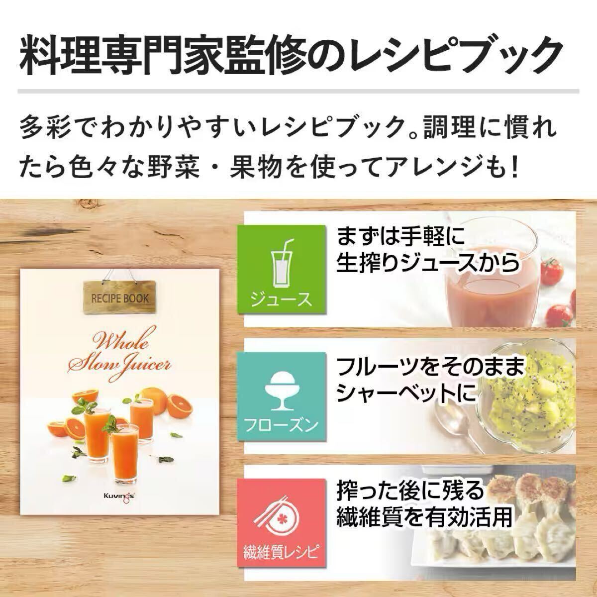 スクリュー、フローズンデザートストレーナー、ストレーナー、回転ワイパー、押込み棒、ジュースカップ、繊維質カップ、洗浄ブラシ、出口洗浄用ブラシ、洗浄用回転ブラシ、取扱説明書、レシピ本、クイックガイド、保証書