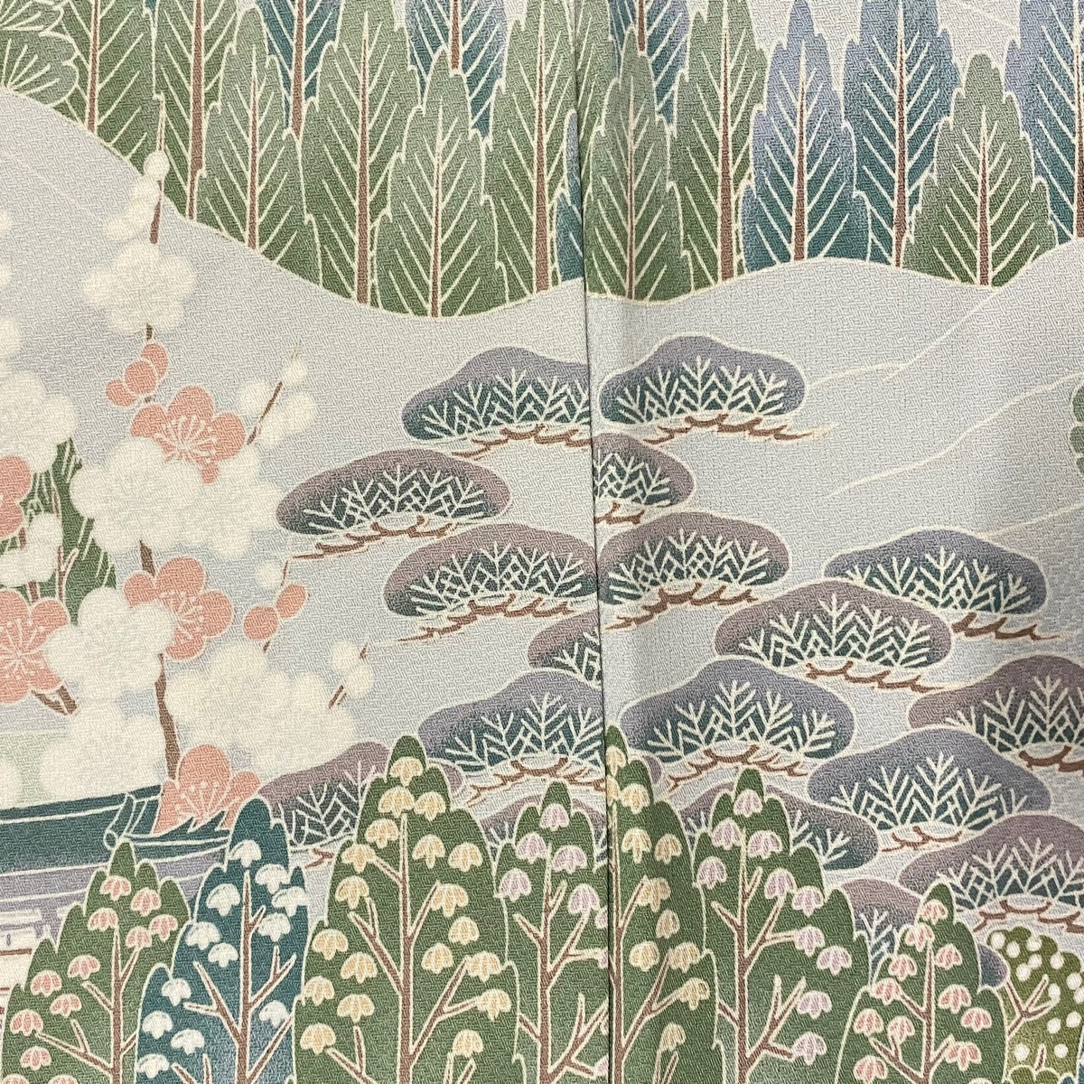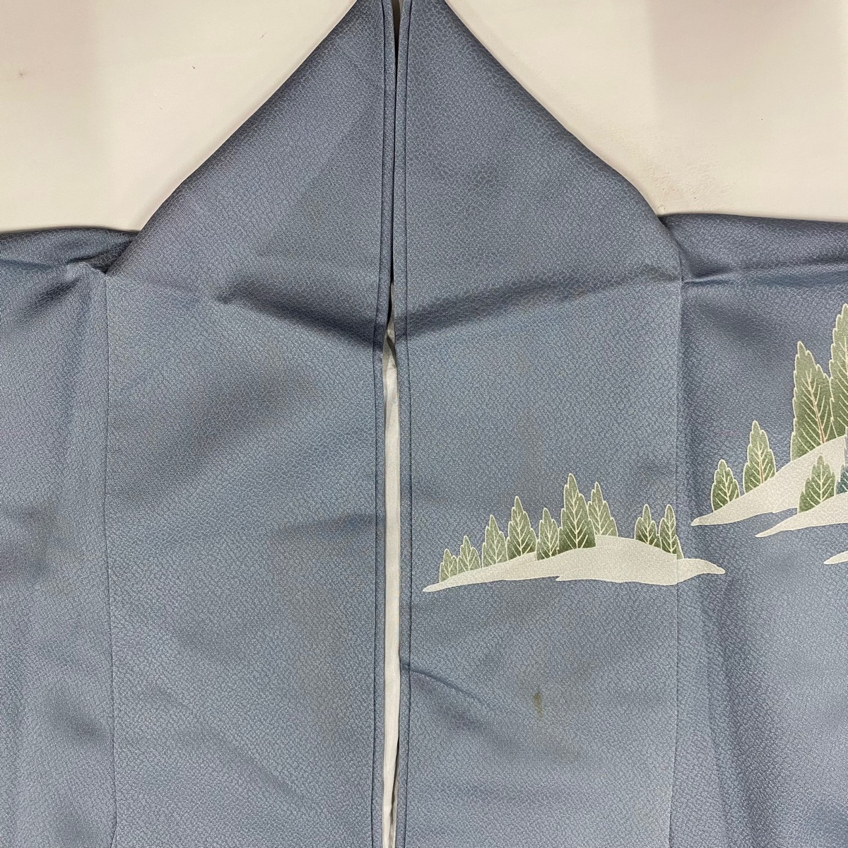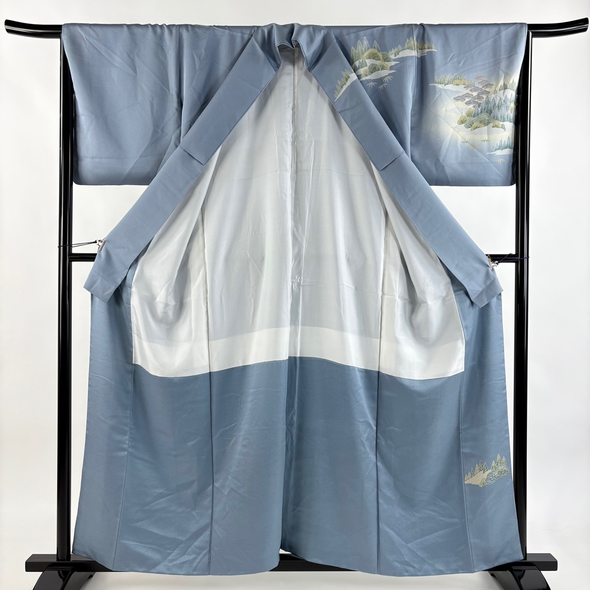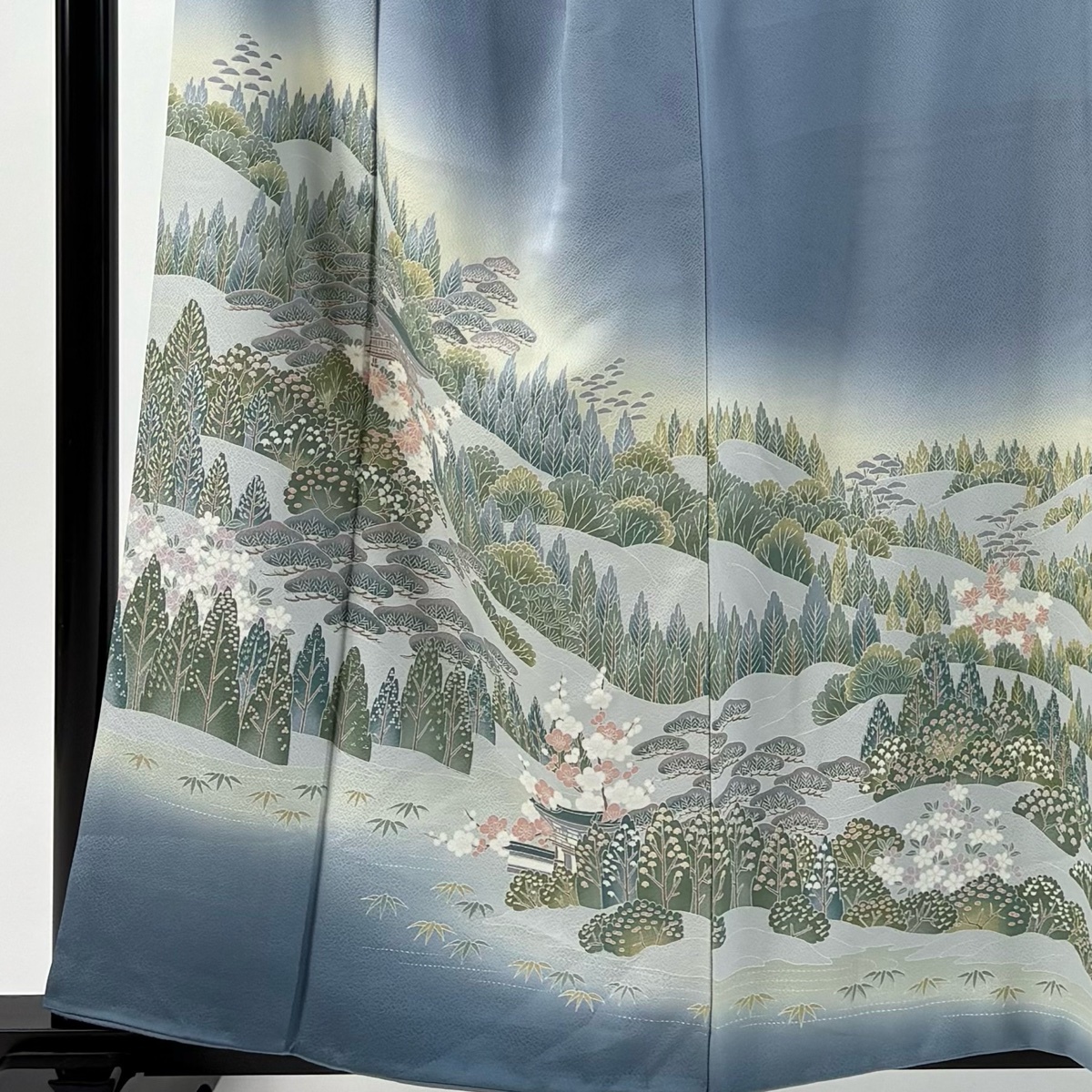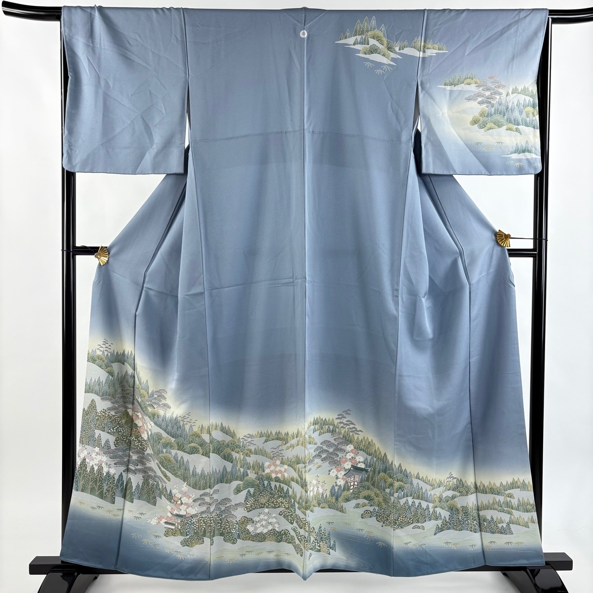 | 訪問着 秀品 建物 樹木 ぼかし 青灰色 袷 身丈159 裄丈66.5 M 正絹 【中古】 |