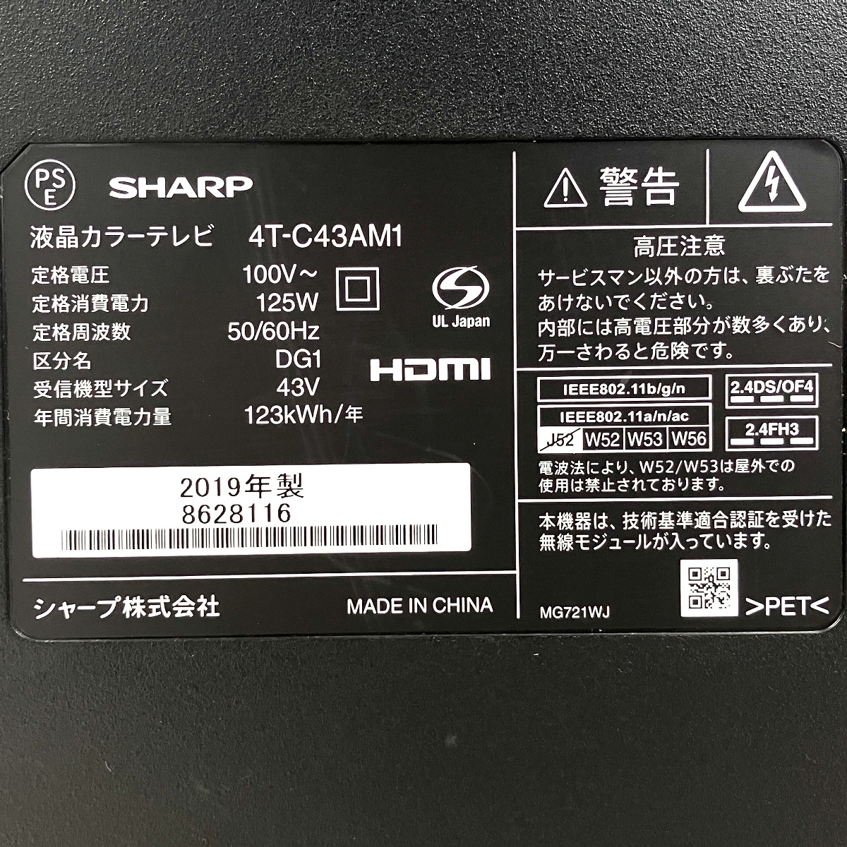 | SHARP 4T-C43AM1 AQUOS 液晶 テレビ 43インチ 2019年製 TV シャープ アクオス 映像 機器 家電 ジャンク F9456841 |