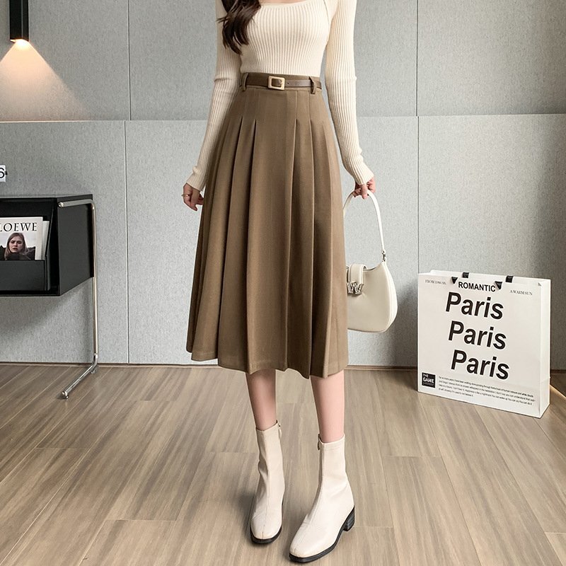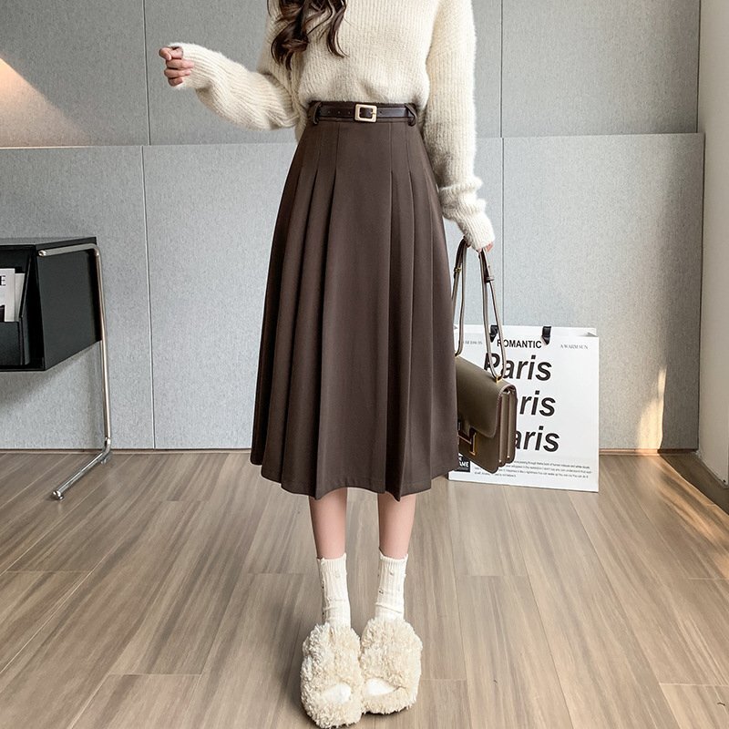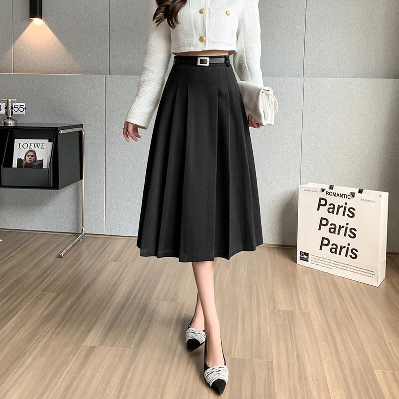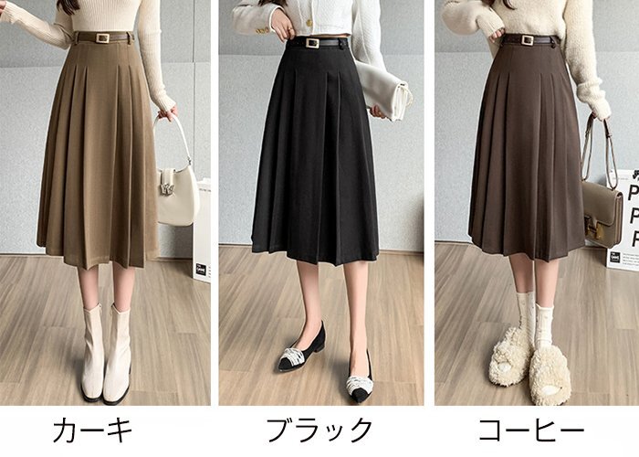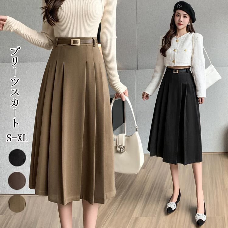 プリーツスカート レディース ロング スカート 春 秋 冬 スカート 膝下 Aライン 着痩せ 復古 無地 ベルト付き★3色選択可/S~XLサイズ