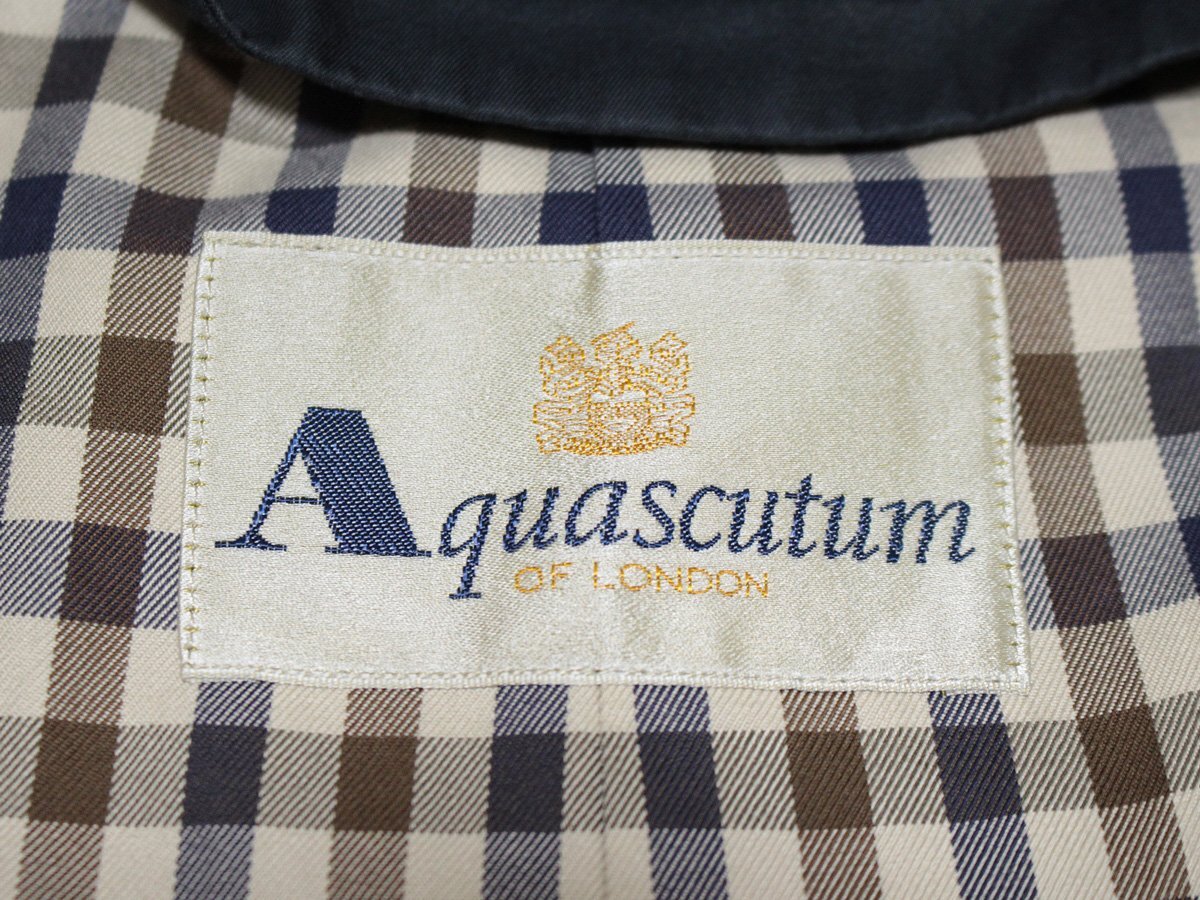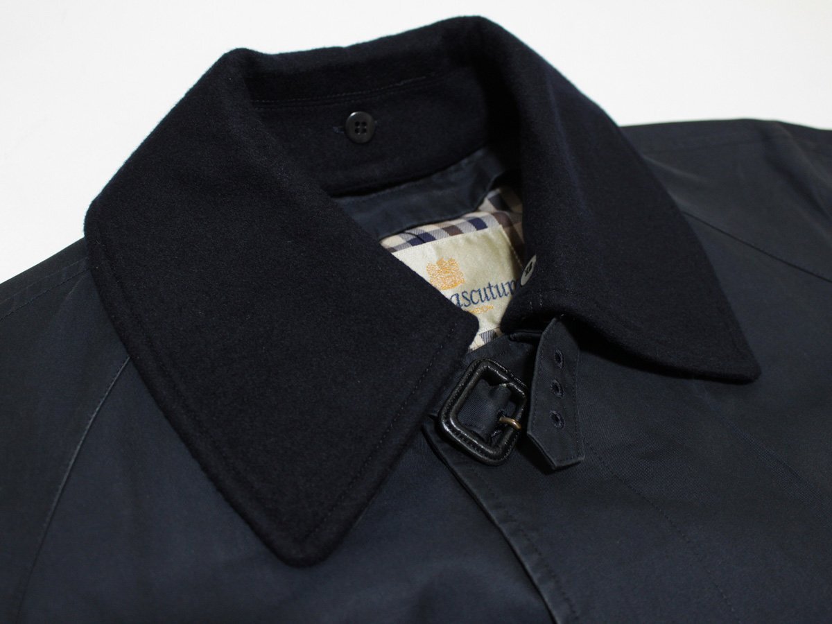 Aquascutum アクアスキュータム 襟カシミヤ ベルト付き ステンカラーコートです。素材は表地:綿100%、衿:カシミヤ100%、胴裏:綿、袖裏:キュプラになります。襟のカシミヤ部分は取外しできます。ライナーはございません。