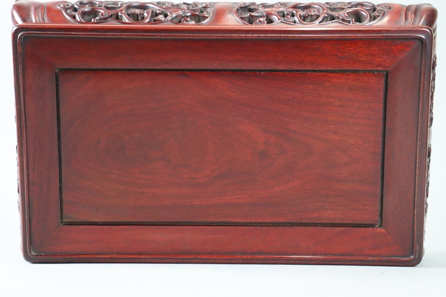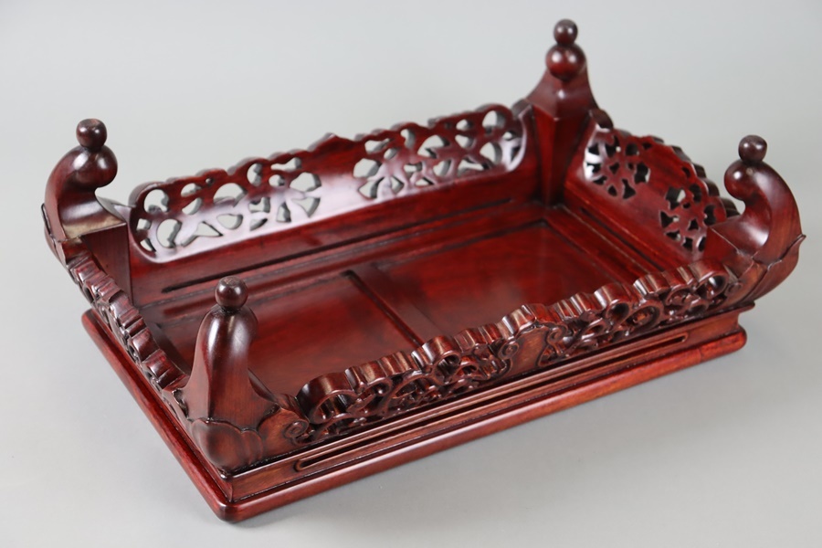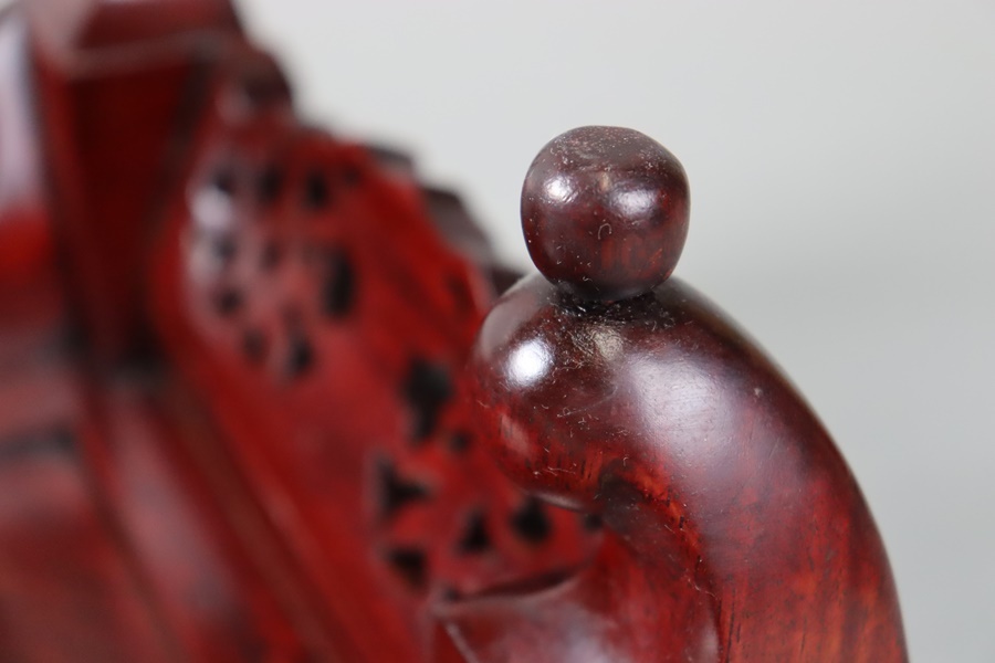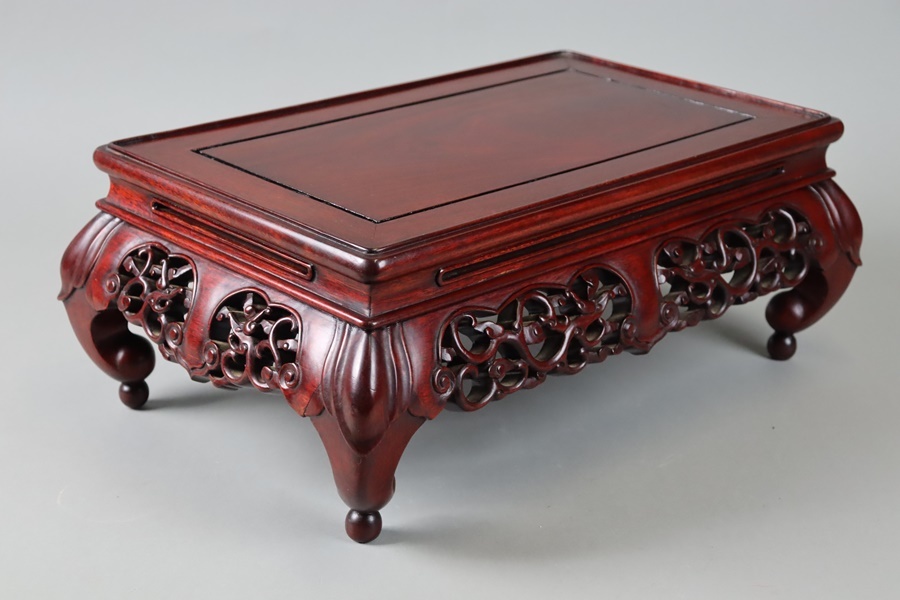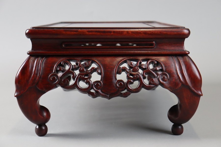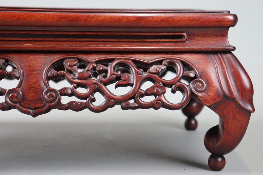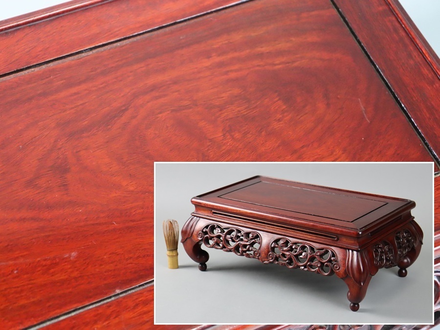 【中国古玩 唐木造 紫檀 霊芝透彫刻 玉付 花台 幅46,5cm】