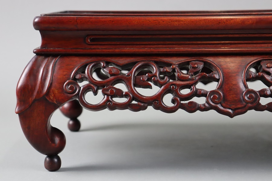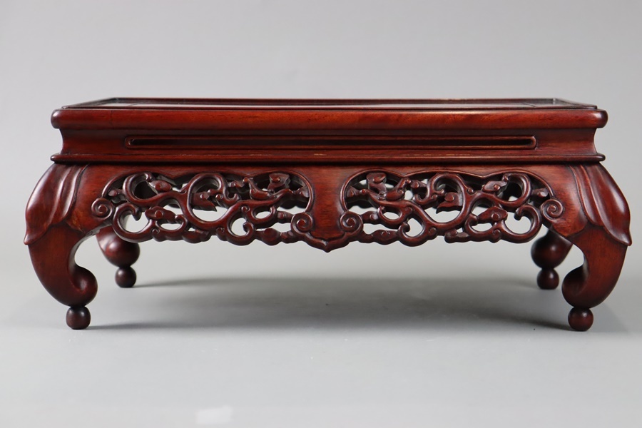 中国古玩 唐木造 紫檀 霊芝透彫刻 玉付 花台 幅46,5cm 飾台 盆栽台 香炉台 黄花梨 細密細工 古美術品[d1202]