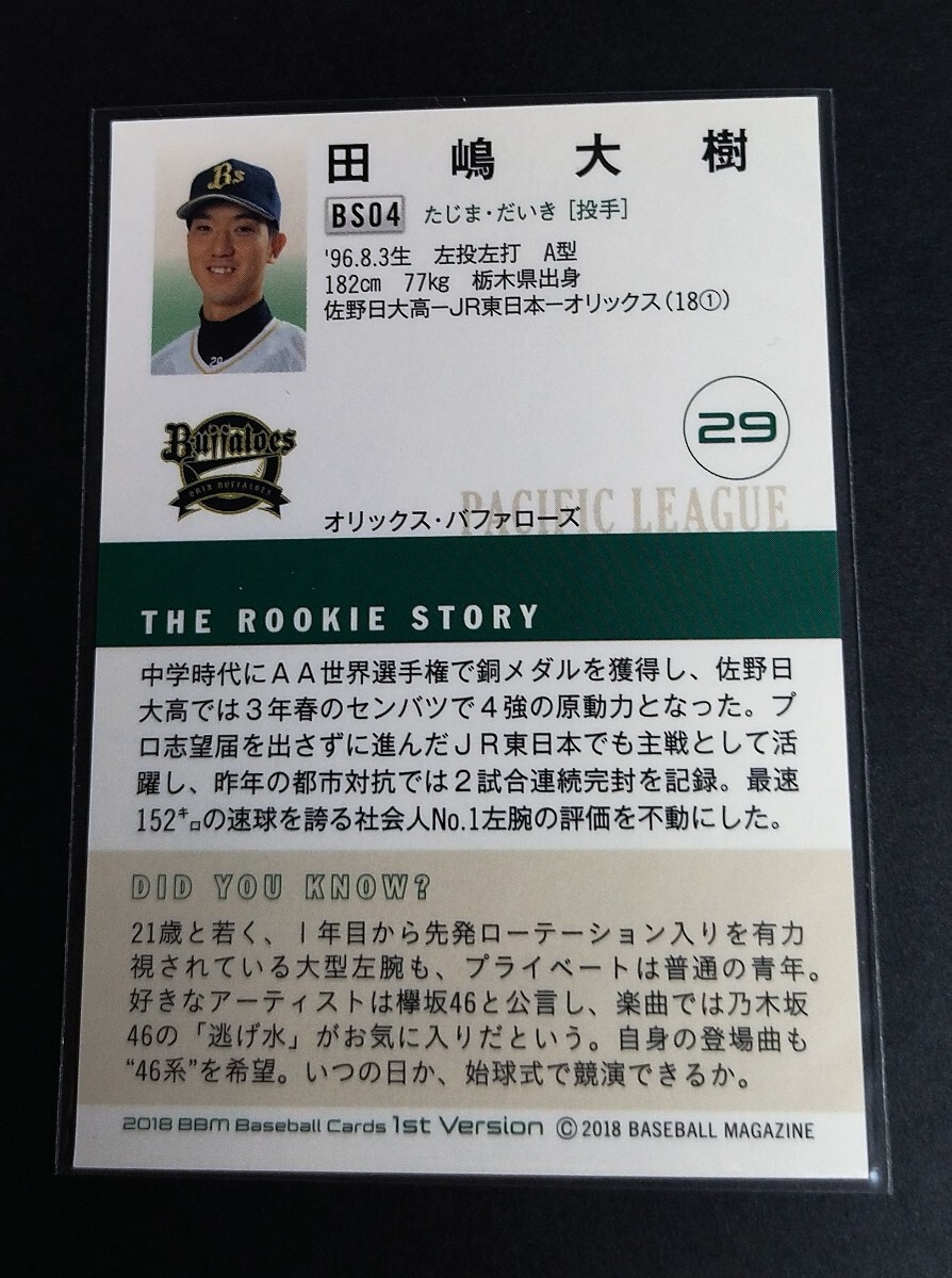 2018年BBM 1st 田嶋大樹(オリックス)ルーキー。書店限定サインカード。No,BS04。