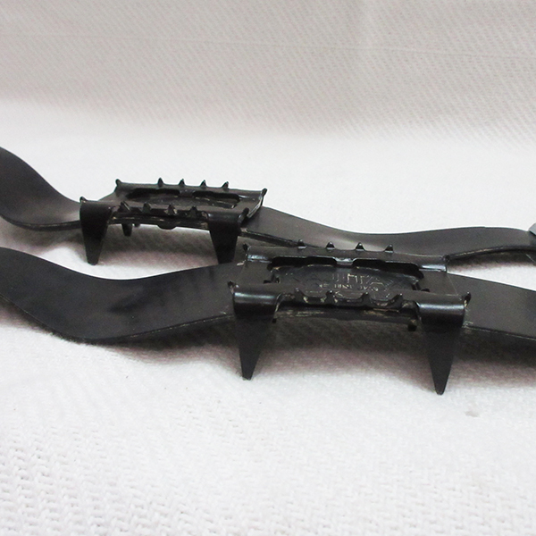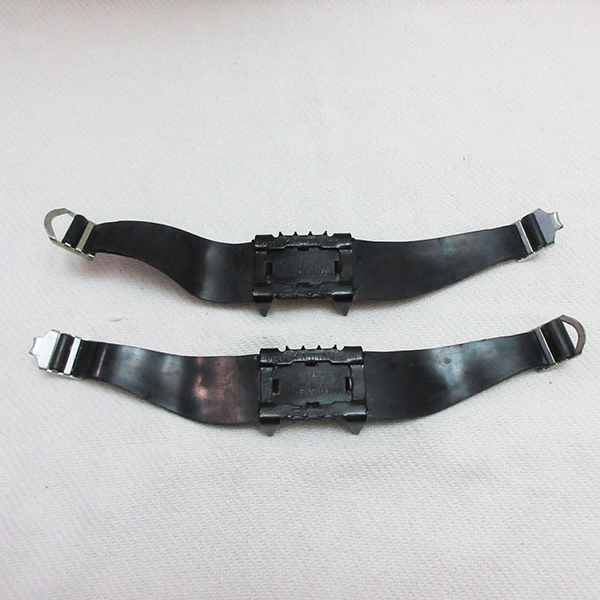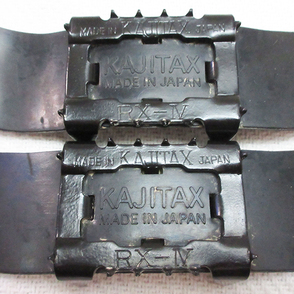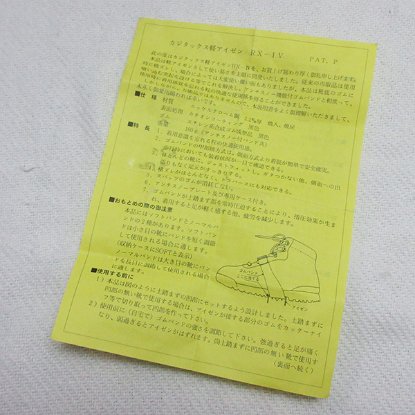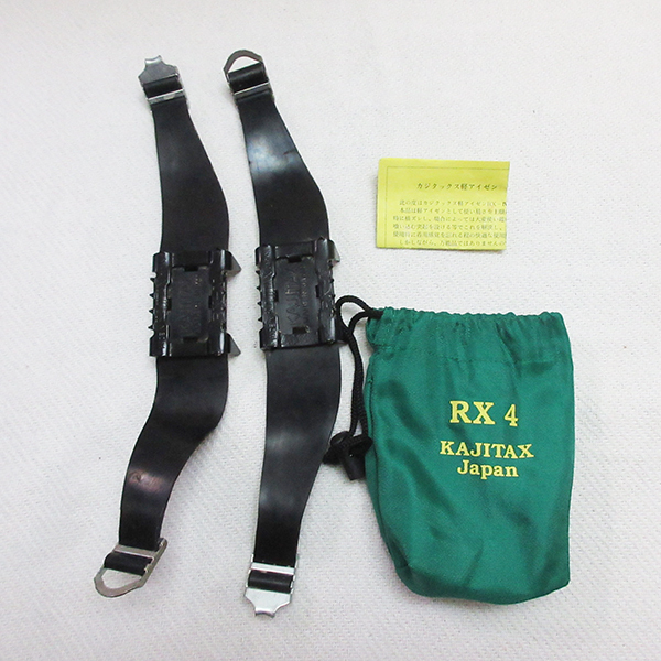 ●KAJITAX アイゼン 4本爪 ゴムバンドを自分のブーツに合わせて調節しておけば、夏の雪溪登り、砂礫の急斜面、凍り付いたハイキング道や峠道などの滑りやすいところで、ワンタッチで、簡単に着脱できるRX-4ミニアイゼン。 軽く清掃しましたが、泥汚れ・キズ・多少の使用感があります。 現状でのお渡しになします。 ●重量:約85g(片足) ●サイズ:スパイク部 5.8×4.5cm(メーカー刻印部付近を測定) | ||