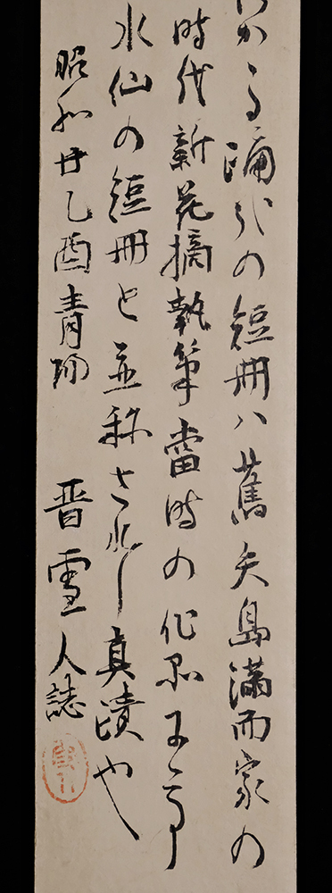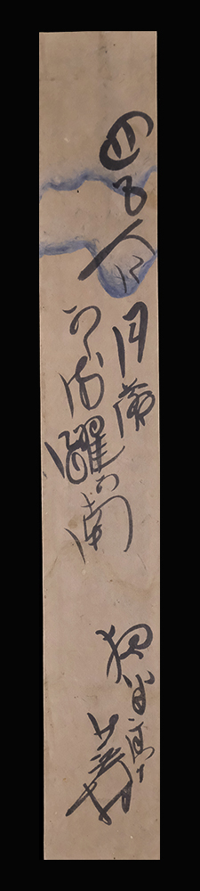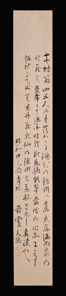 【翻字】 「四五人に月落ちかかるをどりかな 夜半亭蕪村」 諏訪地方の旧家矢島家に伝来した蕪村真蹟で、紙背に小平雪人(晋雪人)筆識語があります。 「蕪村翁四五人に月落ちかかる踊哉の短冊ハ旧矢島満而家の 珍蔵●夜半亭継承時代新花摘執筆当時の作品にて 諏訪にては関紫竹蔵水仙の短冊と並称されし真蹟也。 昭和廿乙酉青● 晋雪人誌」 紙本(内曇入)肉筆未装短冊1点 作品寸法:36.0cm x 5.2cm 商品状態:良好。実際の品を画像にてお確かめ下さい。 ★本品は印刷ではなく肉筆保証の作品です。 ★本品は真作保証の作品です。 与謝蕪村/よさ-ぶそん 1716-1784。江戸時代中期の俳人,画家。 享保(きょうほう)元年生まれ。20歳ごろ江戸にでて早野巴人(はじん)(夜半亭宋阿)に俳諧をまなぶ。師の死後は関東,奥州を遊歴し,宝暦元年京都にうつる。写実性,浪漫性,叙情性にとむ俳風で中興期俳壇の中心的存在となる。晩年は蕉風(しょうふう)復興を提唱。画家としては文人画を大成,代表作に池大雅との合作「十便十宜図」がある。天明3年12月25日死去。68歳。摂津東成郡(大阪府)出身。本姓は谷口。俳号は別に夜半亭,紫狐庵など。著作に俳体詩「春風馬堤曲(しゅんぷうばていのきょく)」,句日記「新花摘(しんはなつみ)」など。 出典:講談社デジタル版 日本人名大辞典+Plus |