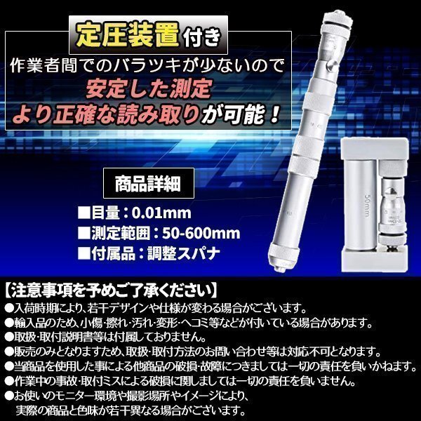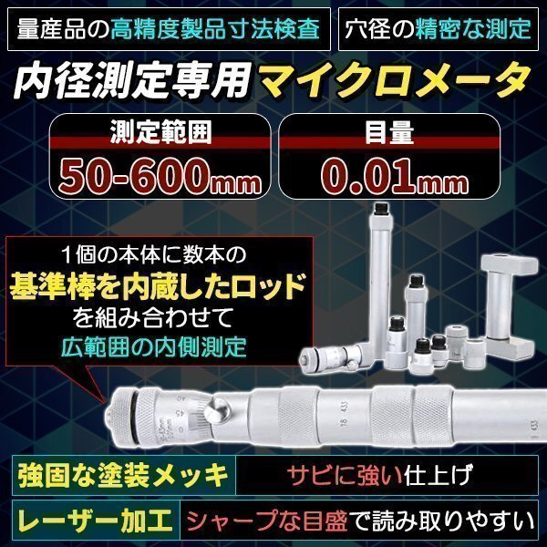 内側マイクロメータ 測定範囲50-600mm 精度0.01mm 内径マイクロメータ 調整スパナ・エクステンションロッド付 つぎたしロッド形