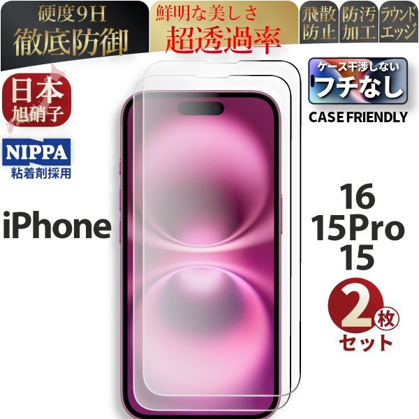 iPhone 16 iPhone 15 iPhone 15 Pro 強化ガラスフィルム 保護フィルム 2枚セット 高品質 旭硝子 自動吸着 液晶保護フィルム