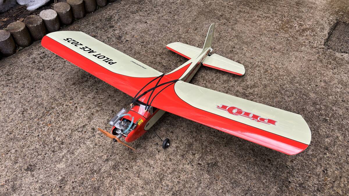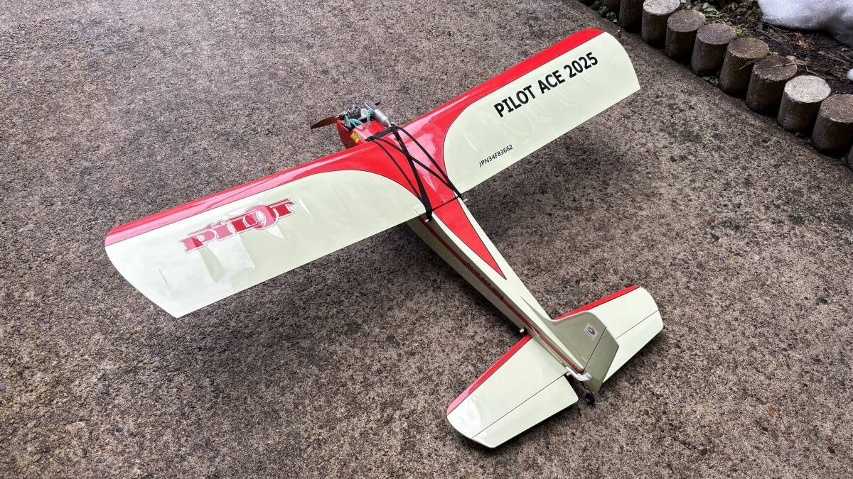 1960年代のOK模型の名機を復刻するにあたり、取扱い易い09-15エンジン用に再設計し、レーザーカットキットとして好評販売中のPILOT ACE 2025 の試作~テスト機体です。飛行テストを行っているため一部傷、汚れはありますが、飛行に特段支障はありません。エンジン、ペラ、サーボ3個、S-FHSS受信機が付属しますので、Futaba FR2F900の受信機用バッテリーを使用すれば即飛行可能です(純正品以外不可)。エレベーター付きの3ch仕様で飛行する場合は特製の主翼取付アタッチメントを使用しますが、それを使用しなければラダーオンリー機としての飛行を楽しむことができます。機体についての詳細はhttps://i-rctech.jimdosite.com/やラジコン技術誌2025年6月~11月号に記事掲載されておりますのでご参照ください。今年9月に行われたKMAノスタルジック競技大会で3位に入賞した機体そのものです。