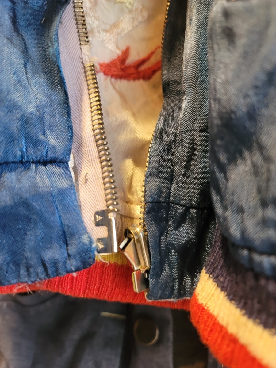 傷、よごれ、破れが多数ございます。タグ無し、ファスナーにもメーカー名はありません。