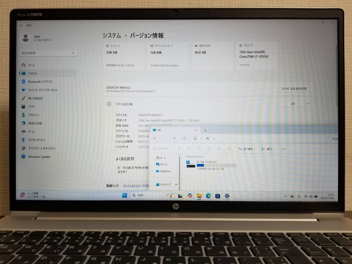 T10 動作品 HP ProBook 450 G10 Core i7 第13世代 (1355U)◆16GB◆NVMe SSD256GB◆15.6インチ Full HD Win11 Office 2021 ノートパソコン