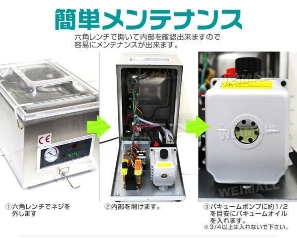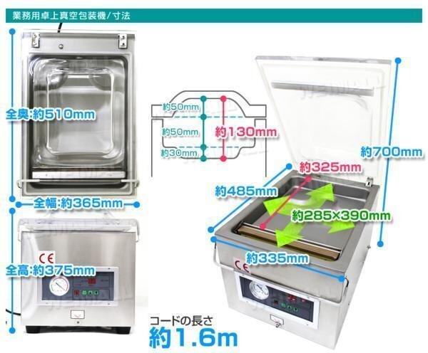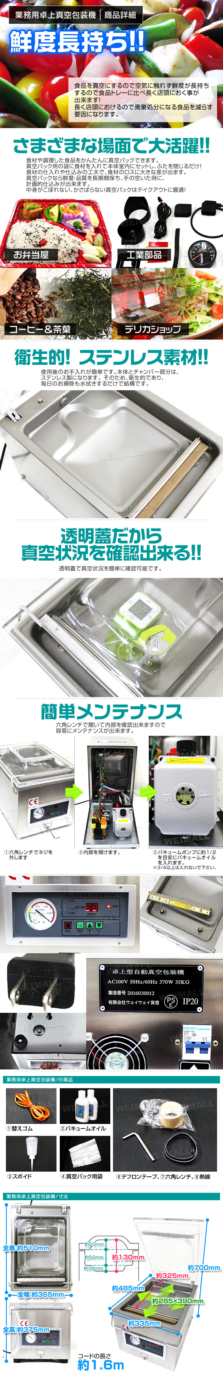 真空パックをすれば、 ・食品のロスを削減!!冷蔵保管で必要な量だけ使用!! ・加熱料理し真空保存しておけば即座に料理が完了!! ・上手な仕込みで大人数の宴会も対応可能!! ・料理済み食品など新鮮なまま搬送可能! ・注文から食品提出までの時間が大幅に短縮!! 真空パック用の袋に食材を入れて本体室内にセットし、ふたを閉じるだけ! 初心者でもできますよ♪ 【商品仕様】 ・材質:ステンレス素材 ・消費電力:370W ・電源:110V(50/60Hz) ・チャンバー内寸法:285×390×130mm ・商品寸法:365×510×375mm ・真空速度:1-4pec/min ・シール幅:260×10mm ・重量:35kg ※市販の真空包装機用の袋もお使いいただけます。 注)支払方法は『代金引換』以外となっております。 不明点がある方は、okuraya_san@yahoo.co.jp までメールにてお問い合わせ下さい。 【説明動画】 ★☆★ここをクリックで使用方法が確認できます。★☆★ 【関連商品】 ・交換パーツ ・家庭用真空包装機 ※写真と実物は多少異なる場合がございます。あらかじめご了承下さい。 |