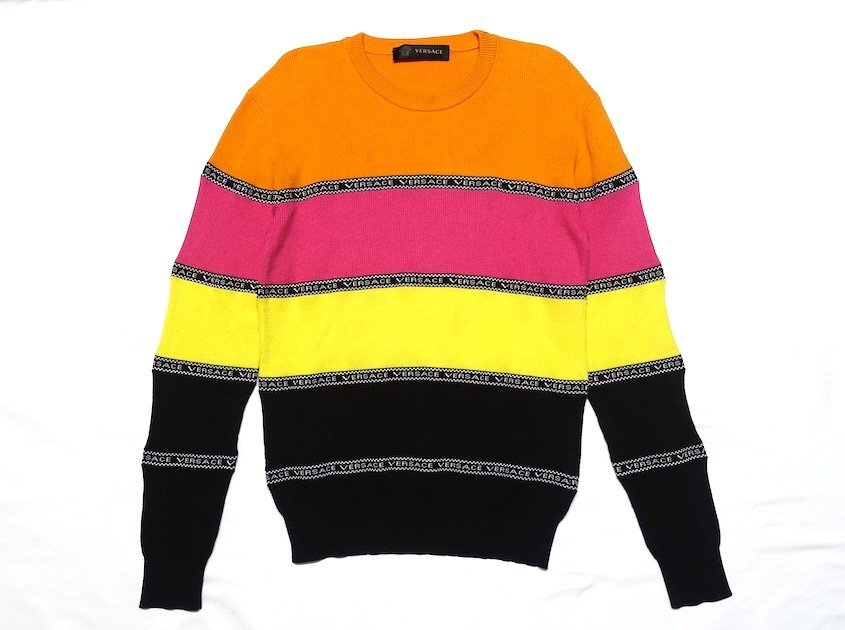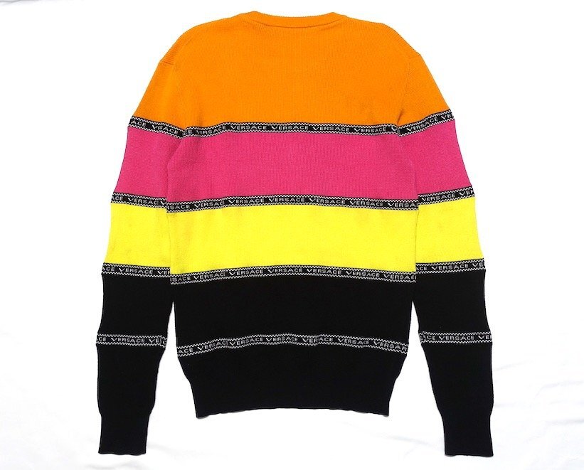 2019年製 美品 VERSACE ヴェルサーチ ロゴ クルーネック ボーダー ニット セーター A81366 コットン ナイロン マルチカラー メンズ 44