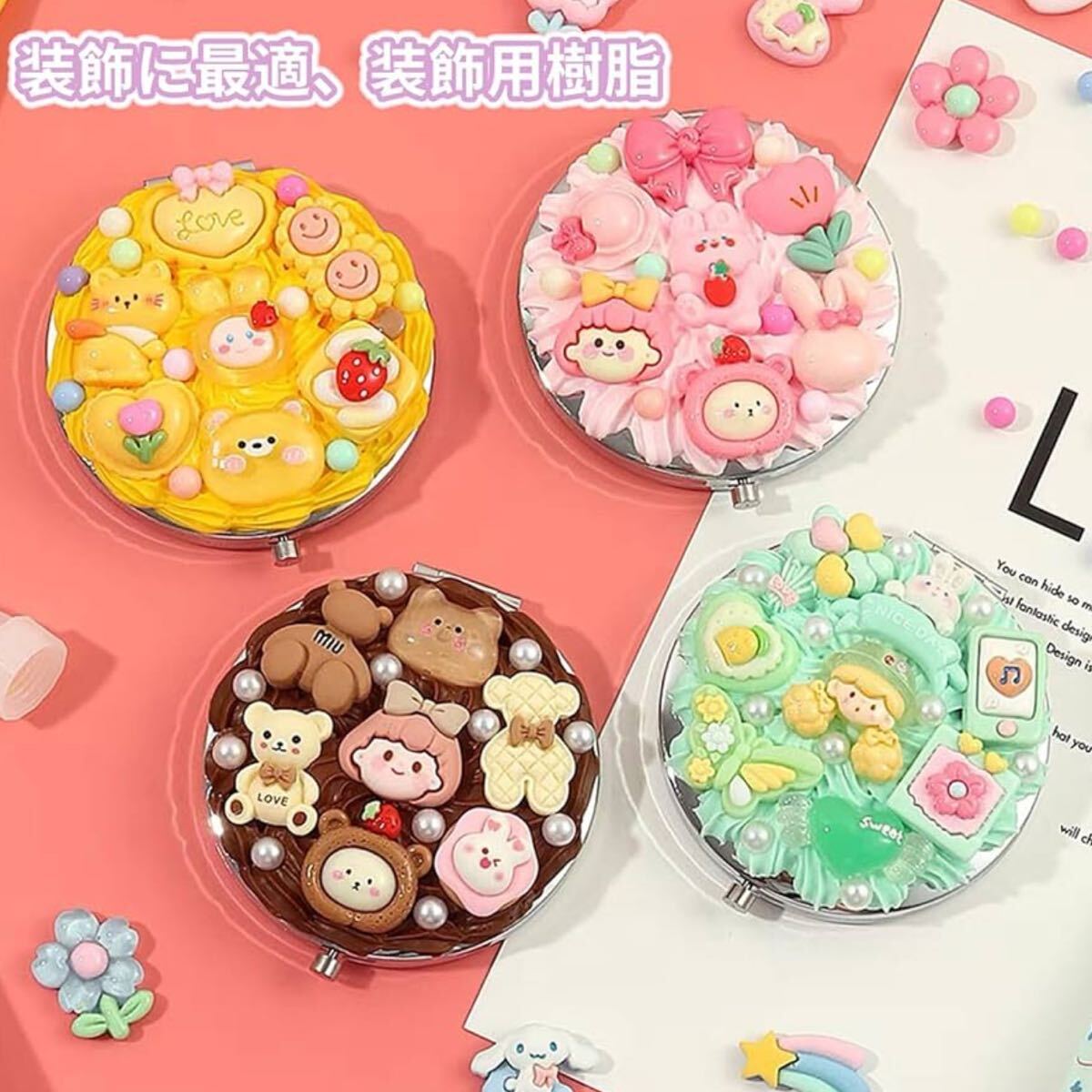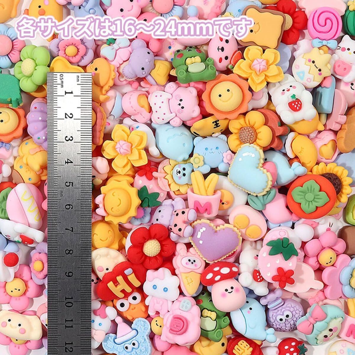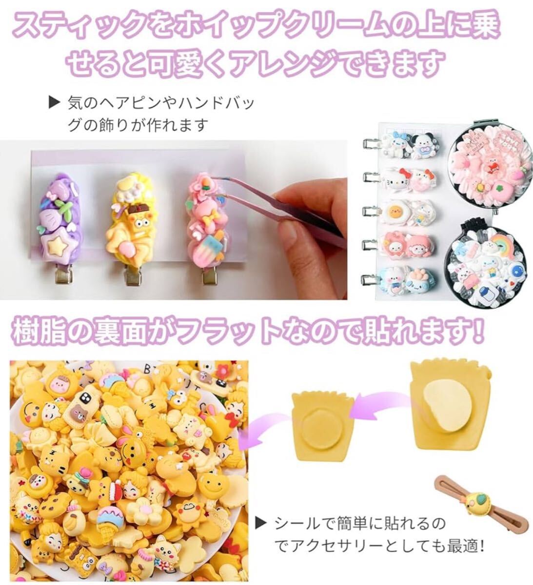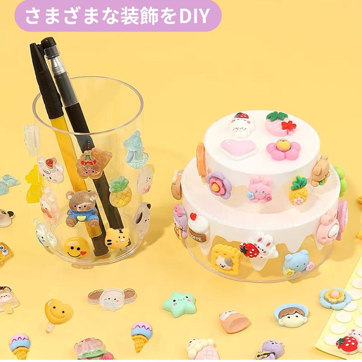 装飾パーツの自由な組み合わせ: 装飾パーツの多様な組み合わせを提供し、手工芸品の装飾を容易にします。お菓子やかわいい動物、デザートなどをテーマにしたパーツで、サイズは18mmから24mmまであります。