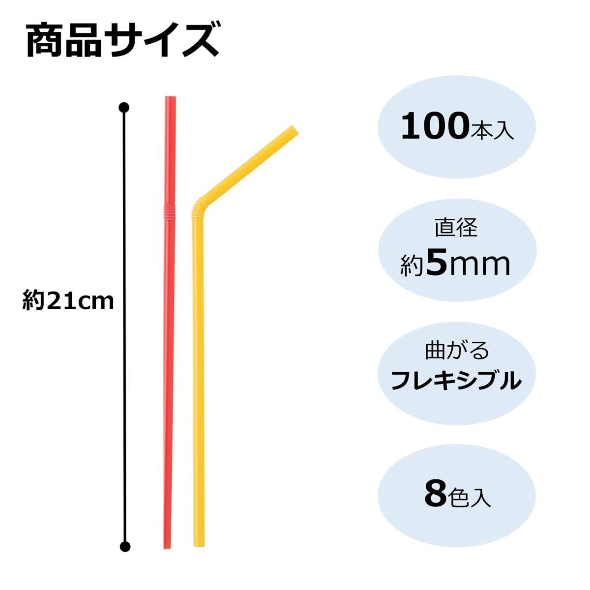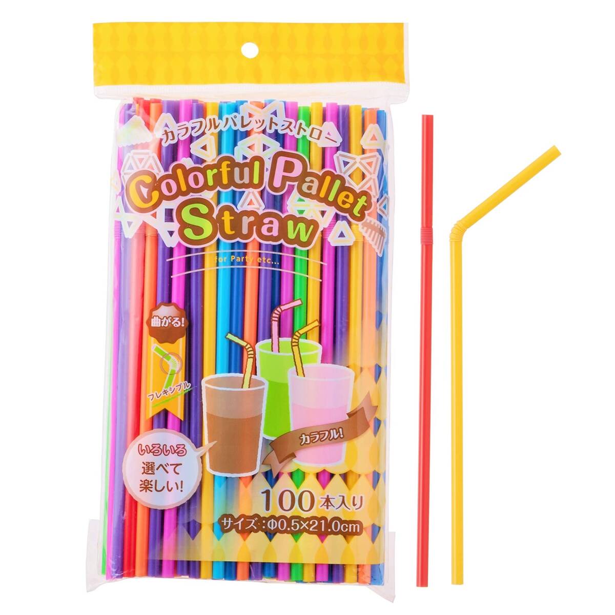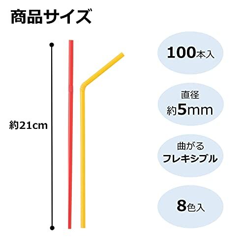 ●8色のカラフルなストロー。●8色で色とりどりなので、パーティーシーン等で見分けがついて便利です。●100本入りで、お得。●小さなお子様の普段使いにもご利用いただけます。●パーティー、お誕生日会、アウトドアのイベントにもお勧めです。●大きい容器にぴったりな長さ21cm。●飲みやすいように角度を変えられるフレキシブルストローです。