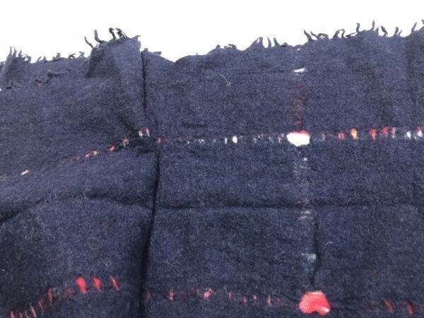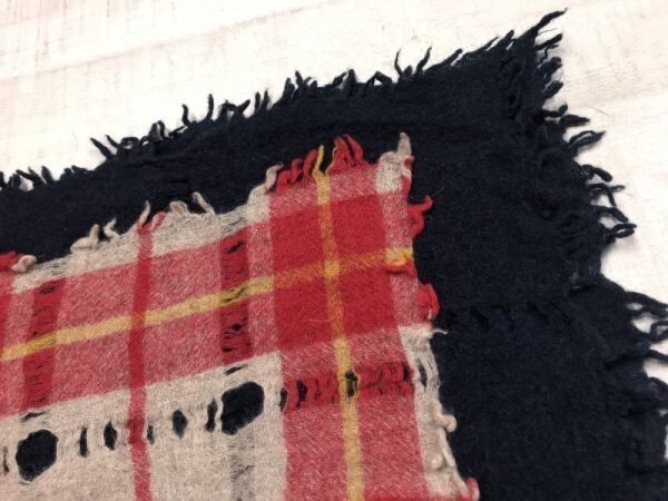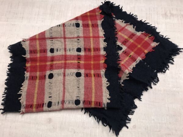 レトロ トラッド モード ウール フラノ フリンジ チェック ダメージ加工 ニット マフラー 男女兼用 赤/紺 です。