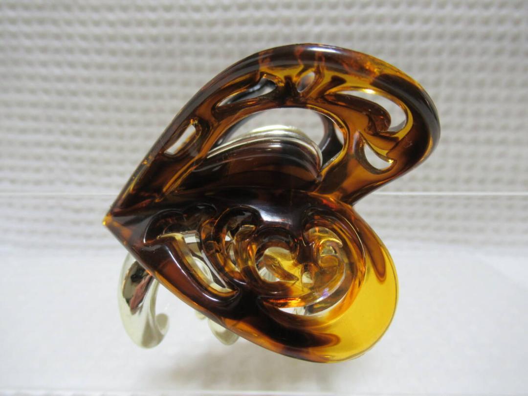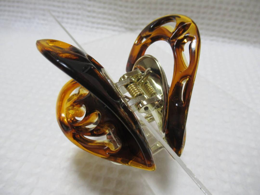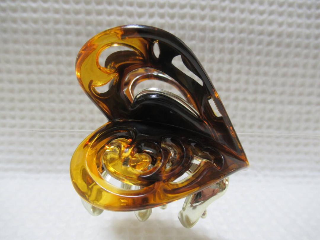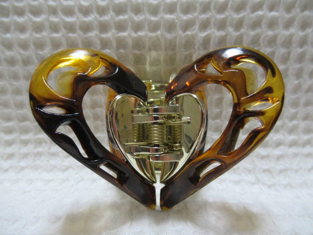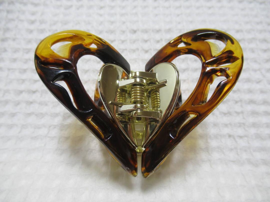 樹脂製透かし入りのハート型付き ゴールド色樹脂製バンスクリップ クリア系ブラウン