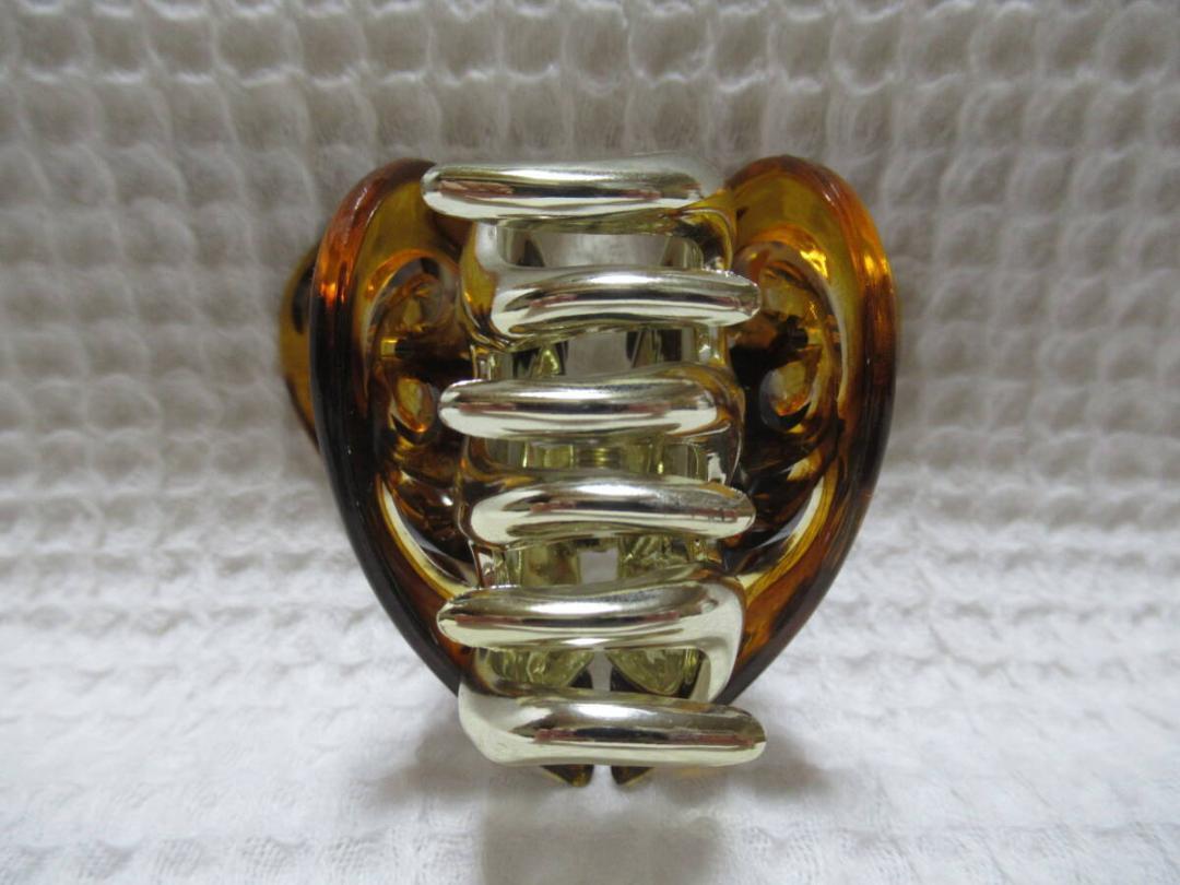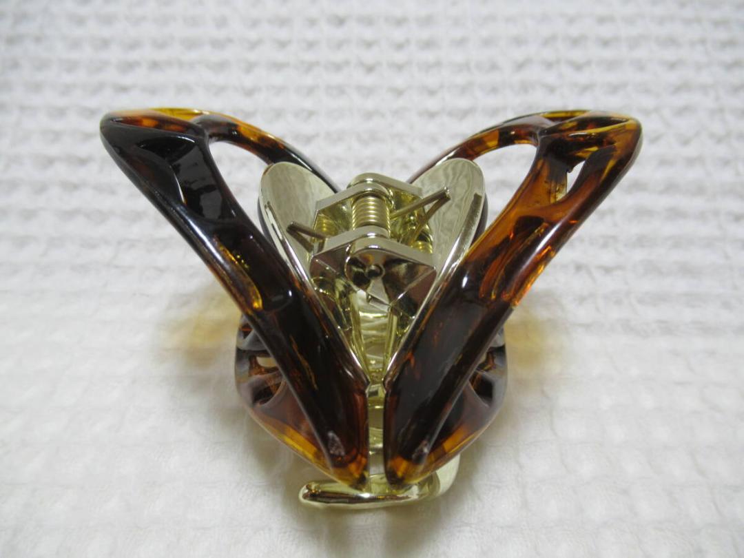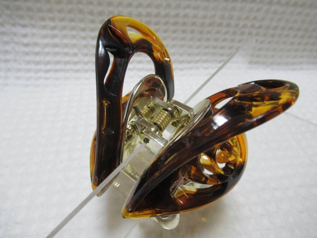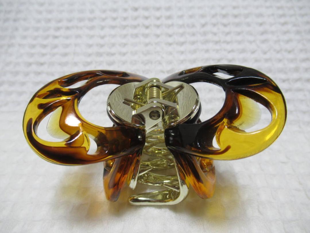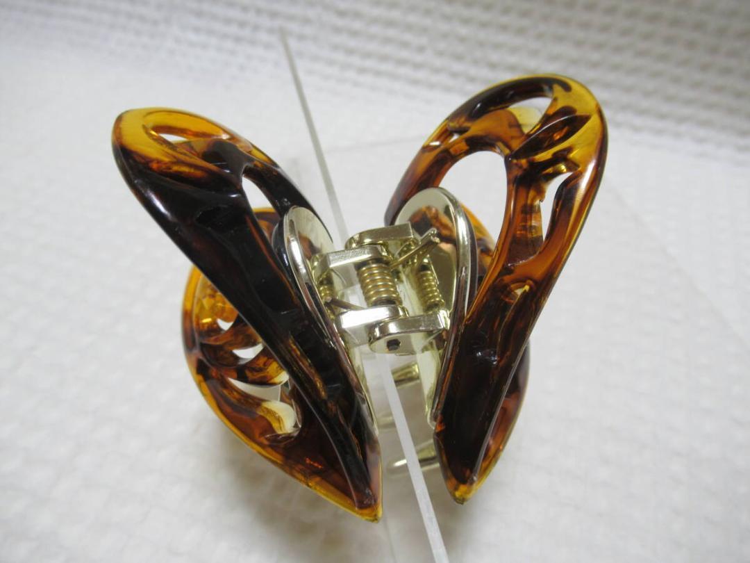 樹脂製透かし入りのハート型付き ゴールド色樹脂製バンスクリップ クリア系ブラウン