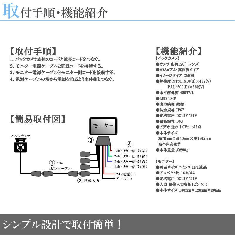| ■24V車対応の液晶モニター + バックカメラ4台セット 液晶モニターとバックカメラのセットなので、こちらのセットだけでバックカメラをご利用出来ます。 ■4分割モニター 接続した最大4つの専用バックカメラを同時にモニター上に表示出来ます。 カメラでないと見れない死角の確認に最適です。 ■7インチオンダッシュ液晶モニター 7インチ液晶なので、バックカメラ用としては、満足出来る大きさです。 また、オンダッシュタイプのため、取り付け場所を選ぶことが出来ます。 ■赤外線LED搭載バックカメラ 赤外線LED搭載モデルのため、視認性が低下し易い夜間でも一定の視認性を確保出来ます。 また、広角カメラなので視認性も高く、より確実な確認が出来ます。 ■ノイズ対策済み 24V車向けカメラでありがちなノイズを軽減出来るノイズ対策済みの専用ケーブルを採用! |