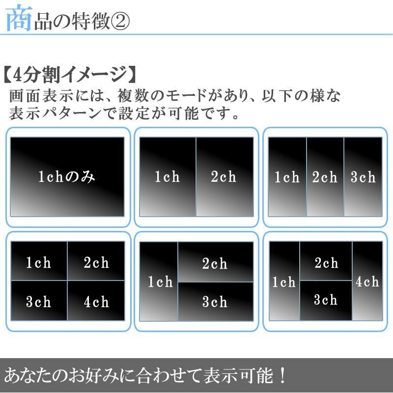 | 液晶サイズ:7インチ アスペクト比:16:9/4:3 映像入力端子:専用4ピン4系統 映像入力切替機能:4ch共にトリガー(+電源)連動可能 定格電圧:DC12V / DC24V 本体サイズ:横180mm × 高さ120mm × 奥行20mm |
