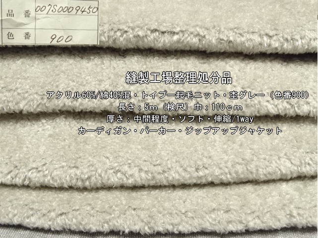 商品説明 | 縫製工場様からの整理・処分品の激安処分です。 商品知識は御座いませんが、大量の余財を処分させて頂きます。 商品は、アクリル60%/綿40%混・トイプー起毛ニット 色調は、杢グレーでございます。 長さは、5m(検尺)巾は、110cmです。 厚さは、中間程度・ソフト・伸縮/1wayでございます。 こちらの商品、一般価格1m/3430円になっておりました。 よろしくお願いいたします。 カーディガン・パーカー・ジップアップジャケットなどに いかがでしょうか。 この機会にお試し下さい。 |