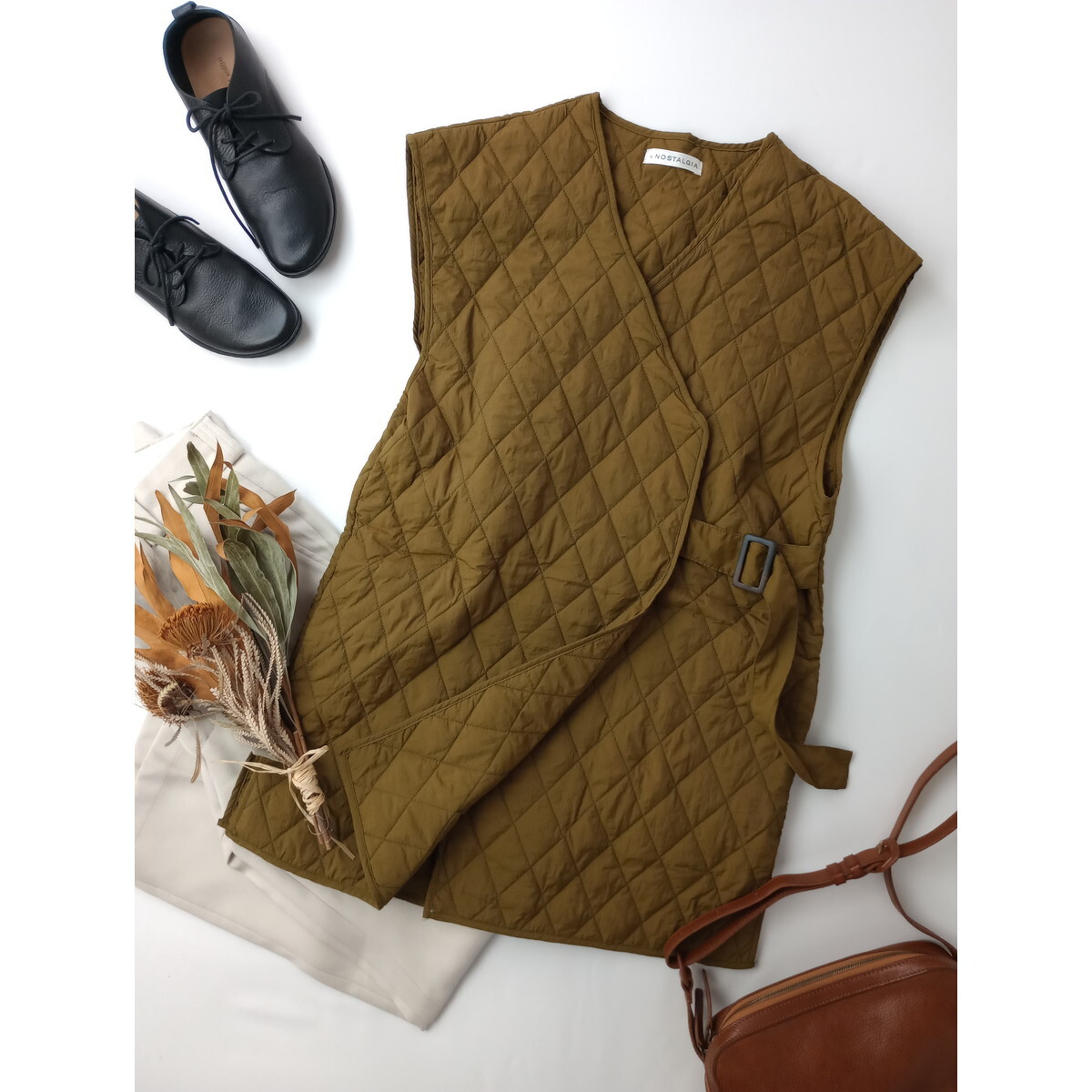 【特徴】縦長のダイヤ柄キルティングが印象的なラップジレベストです。ベルトで留めるデザインにより、開けても閉めてもスタイルが決まり、きちんと感を演出しながらもカジュアルになりすぎません。Vネック仕様で顔周りをすっきりと見せ、重ね着の多い季節にも活躍します。ヒップや太ももをカバーできる丈感で、体型を気にせず着用できるのも嬉しいポイント。きれいめからカジュアルまで幅広くコーディネートに取り入れられる一枚です。