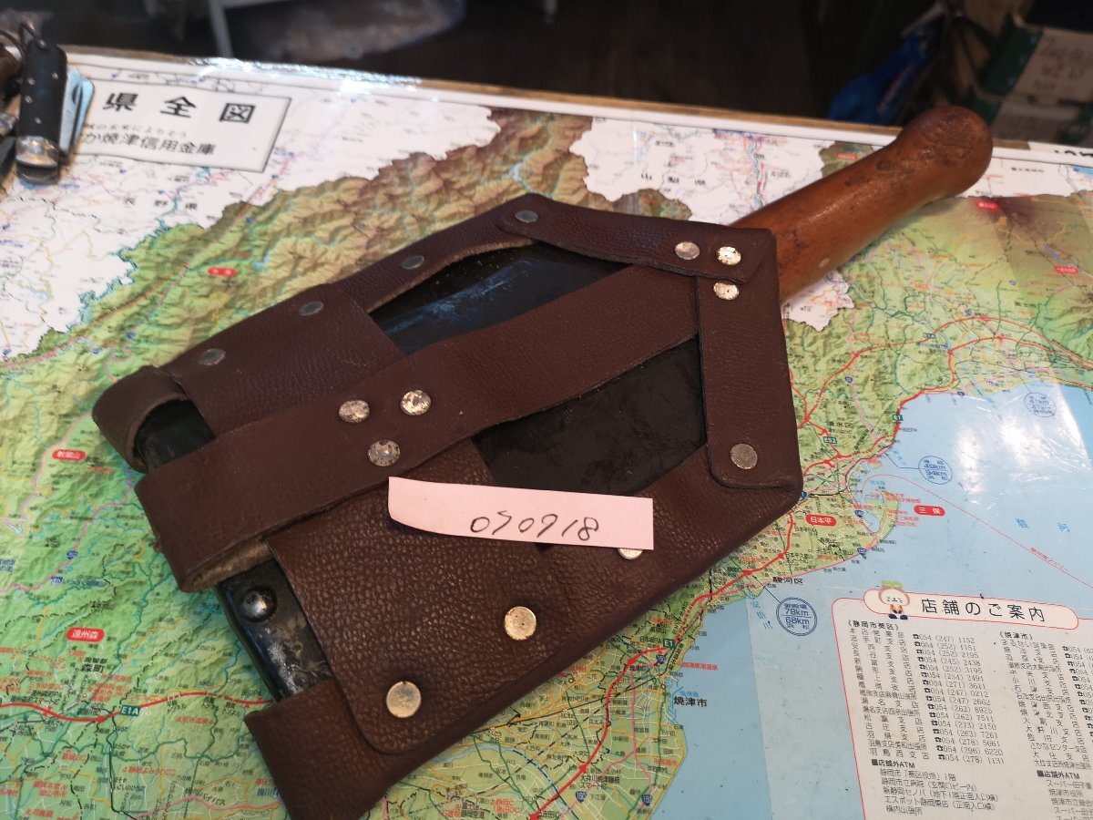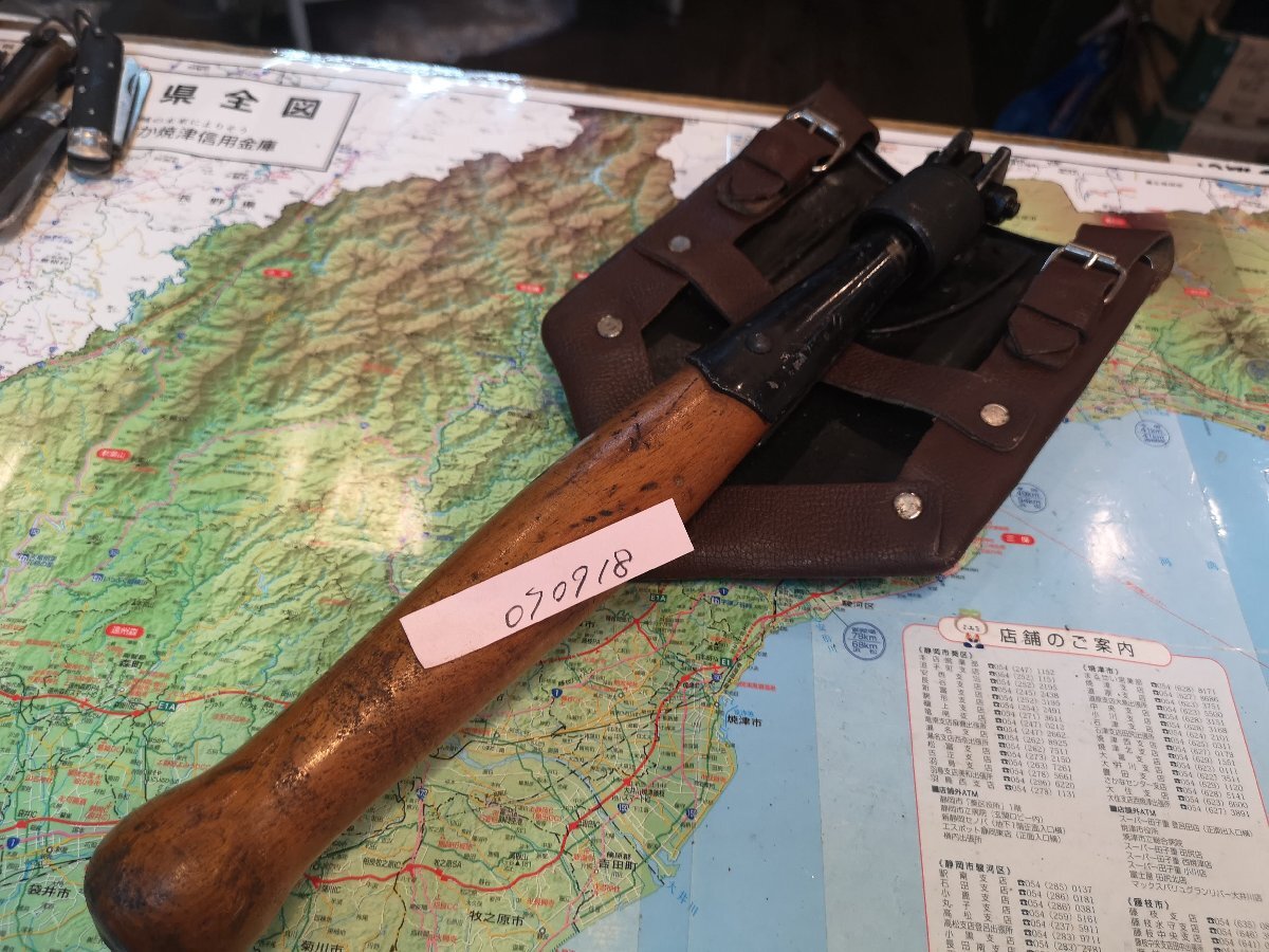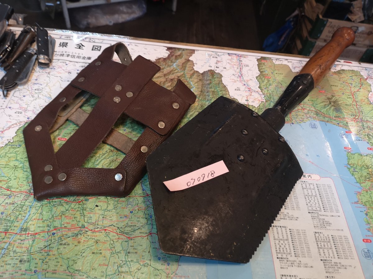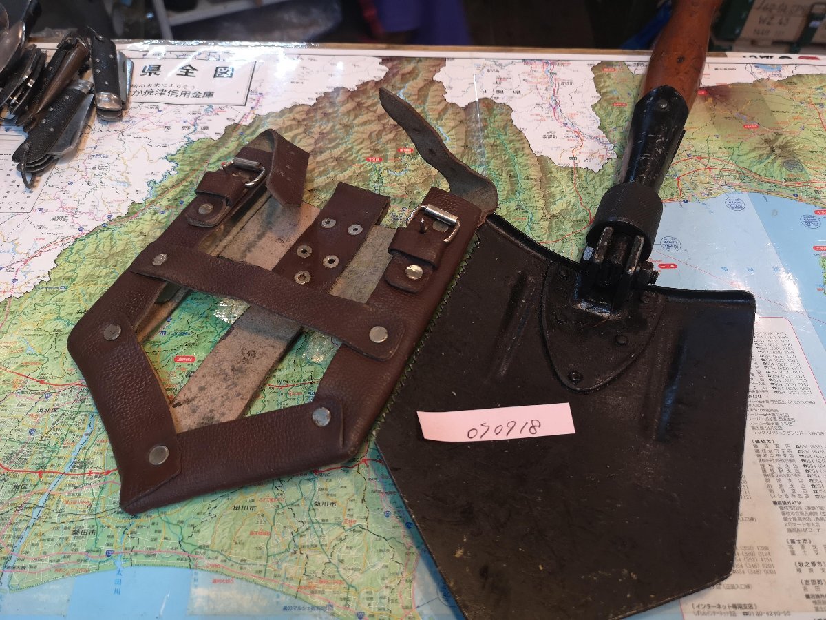 ルーマニア軍にて採用されていたフォールディングシャベルです。 雰囲気のあるレザーのカバーが付属したお洒落なアイテムです。 取っ手は木製になり、持ち手側にむけてシェイプの効いた丸みのある作りになっています。 持ち運びもしやすく、カバー付きなので安心して移動ができます。 キャンプや園芸などに最適です。 また、ディスプレイとしてやインテリア雑貨としてもオススメです。 サイズ:折り曲げた状態 約37cm / 伸ばした状態 約56.5cm シャベル部分 約16cm×約22.5cm。 沖縄離島を除く全国500円でお送りいたします、落札価格にプラスでお願いいたします。キャンプ用品