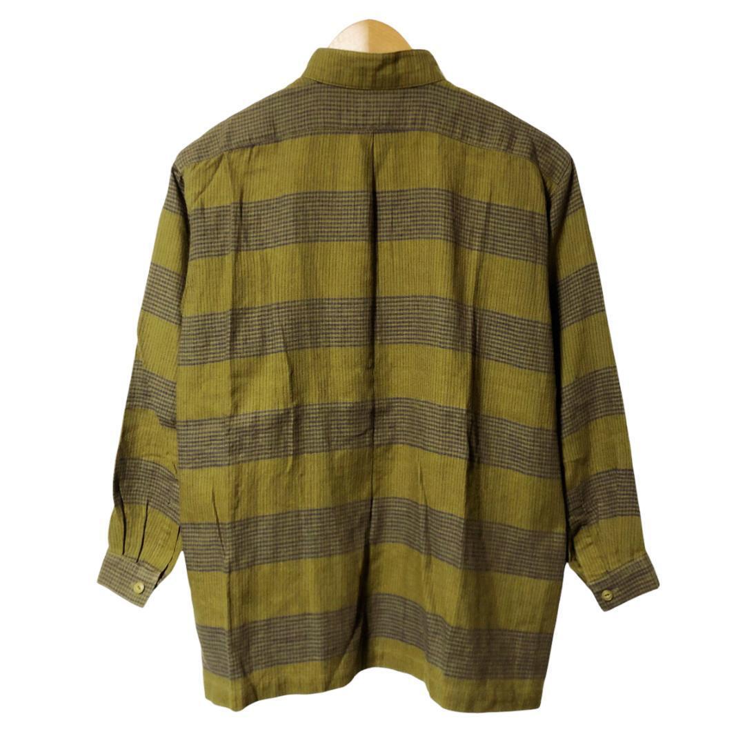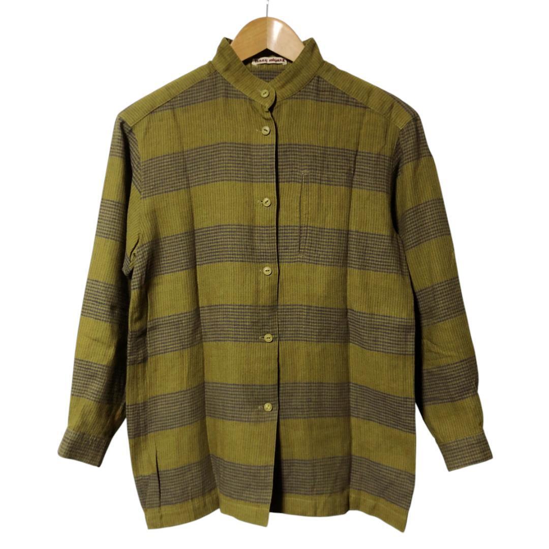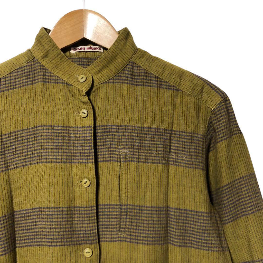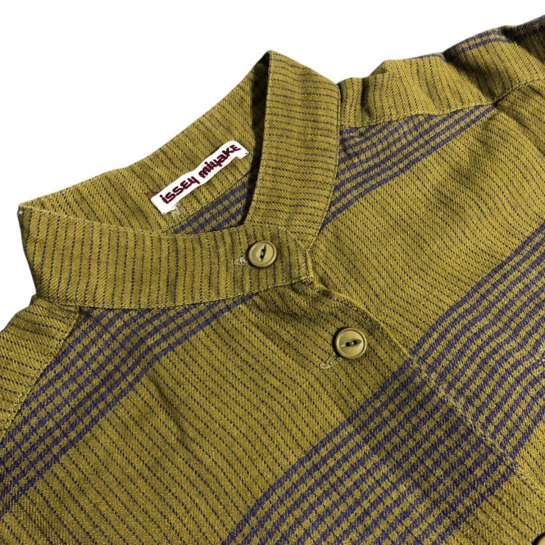 70s ISSEY MIYAKE イッセイミヤケ 初期タグ スタンドカラー シャツ チェック 長袖 カーキ 青 アーカイブ オーバーサイズ レディース M6