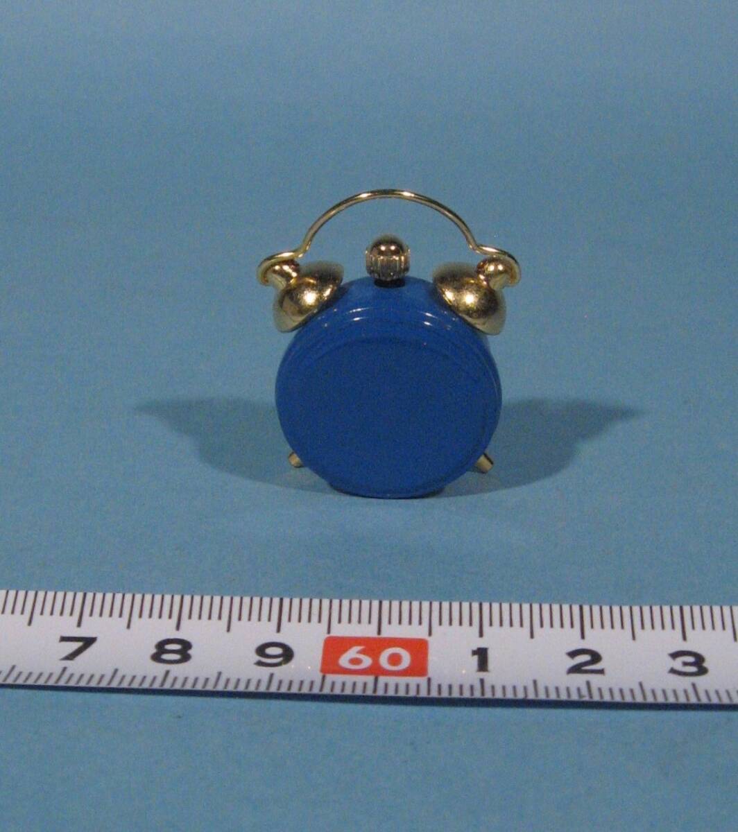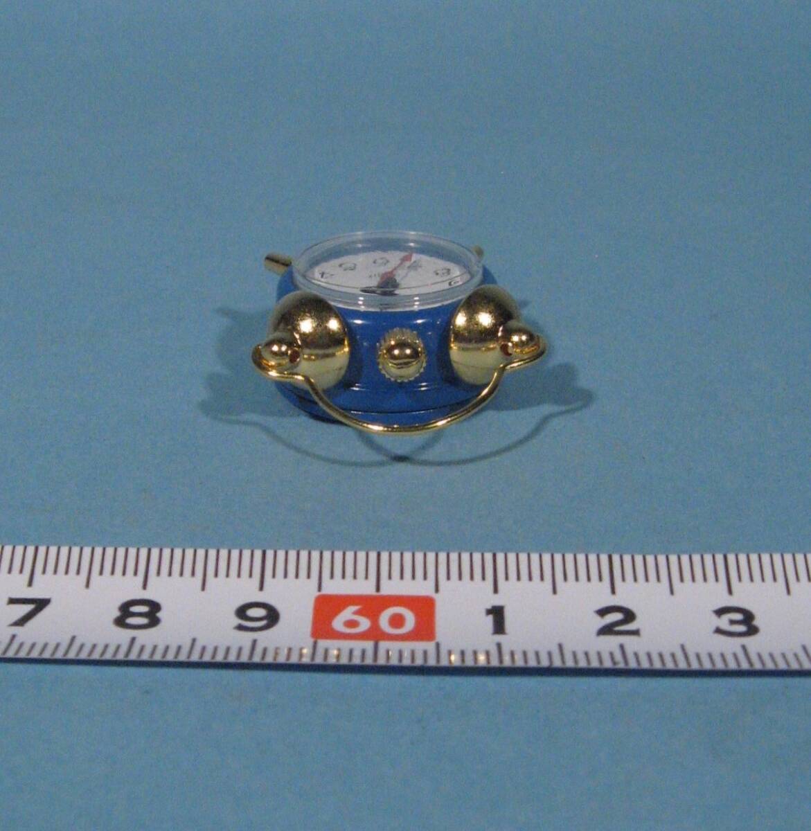 ベルはなりませんがレトロな目覚まし時計をミニチュアで再現しています。竜頭は上部にあるアナログ三針式時計で、秒針は赤色です。