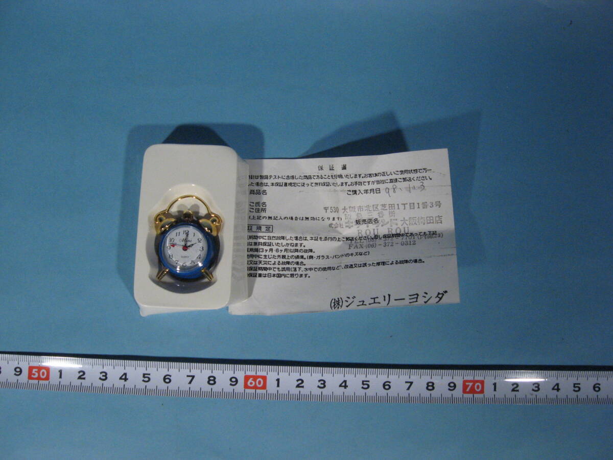 ミニチュアの金属製 スーパー ミニ クロック(高さ3.8cm、幅3.2cm、奥行き1.5cm)で、1998(H10)年に購入後、ガラス保護シールも剥がさず仕舞っていた未使用の新同品です。