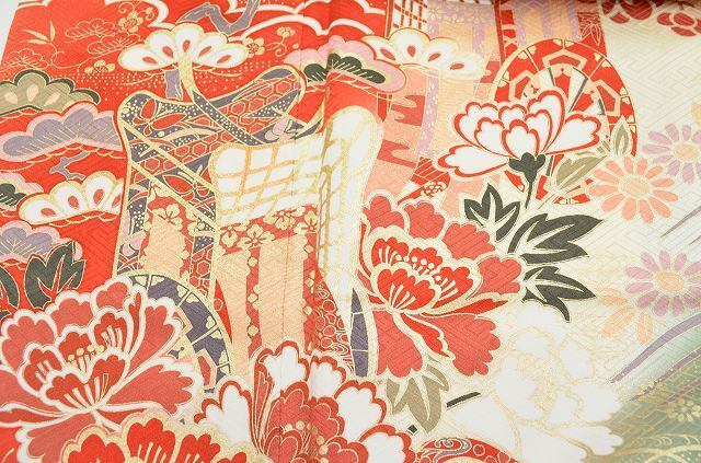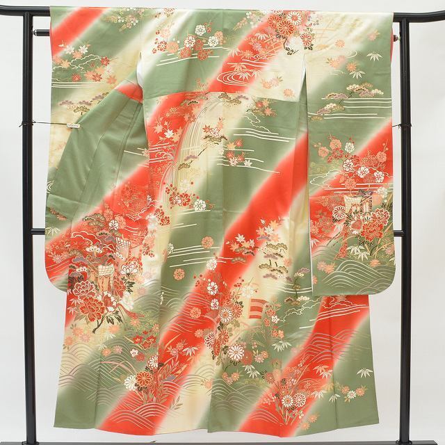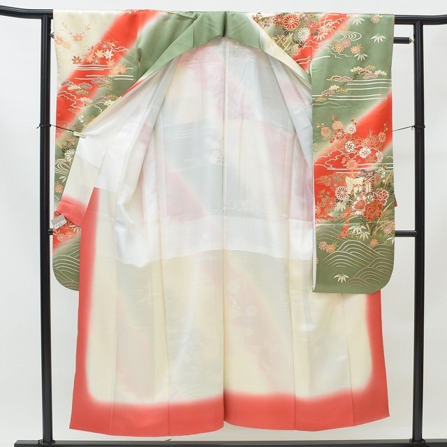赤や緑、白色のぼかし地に御所車や花文様が施された華やかな振袖のお着物です。