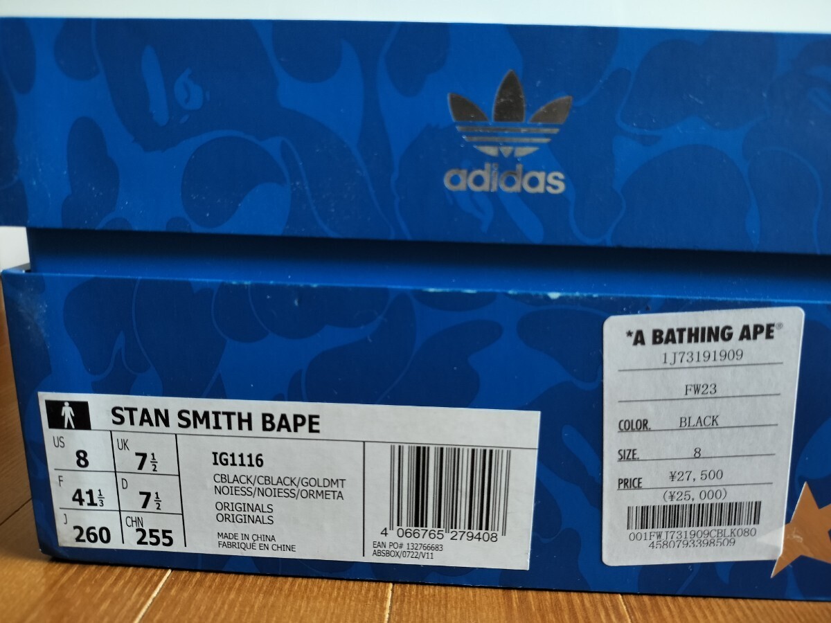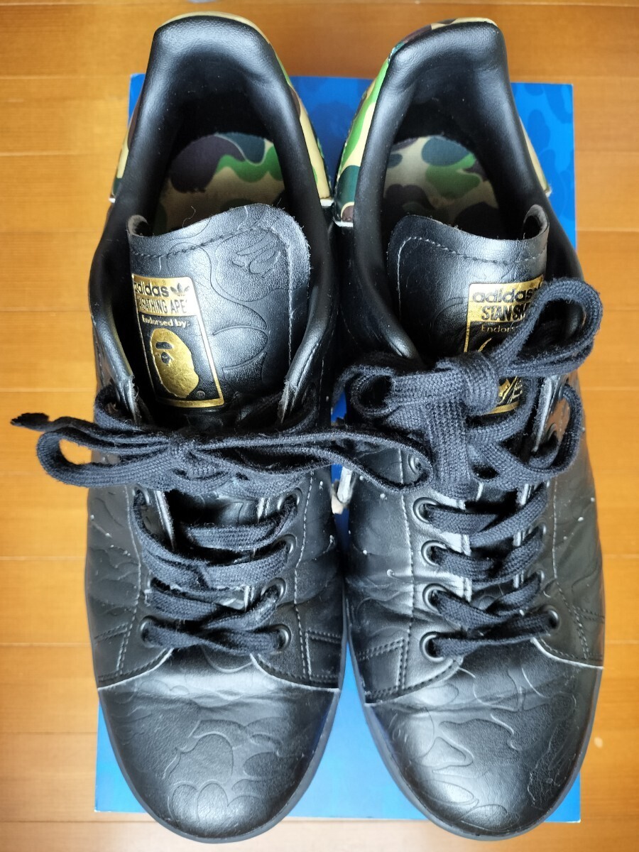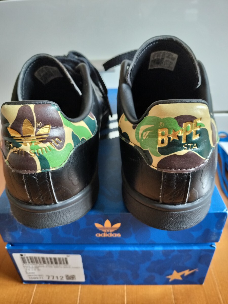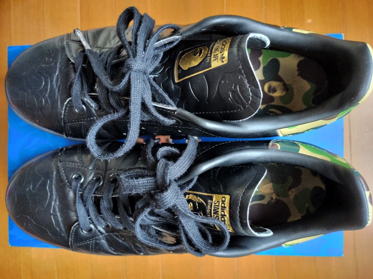 ヒールパッチとソックライナーカバーにはABC CAMOを配し、スタンスミスのシグネチャーである、シュータンのスタン・スミス氏の肖像は、右のみをエイプヘッドを金箔であしらい、このコラボレートを象徴しています。