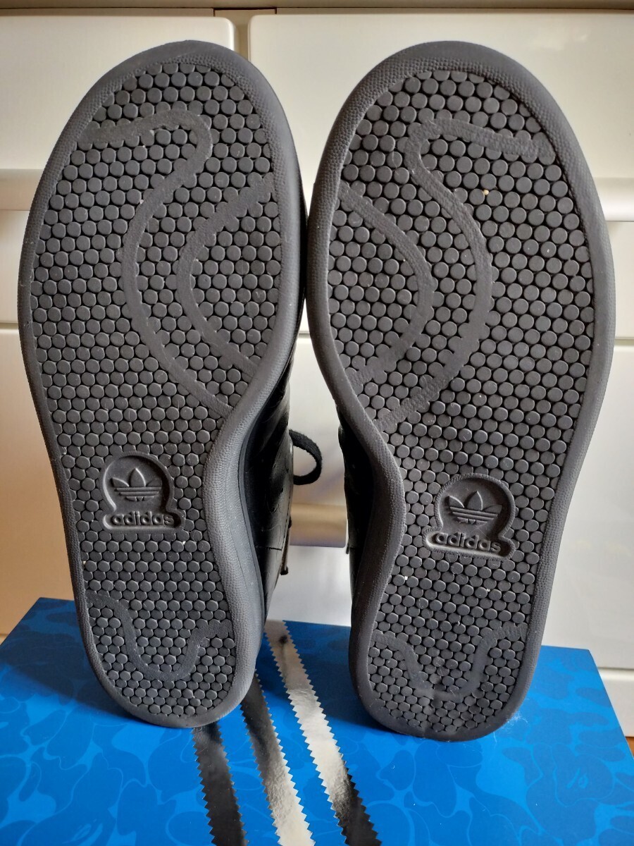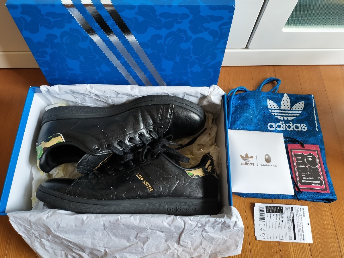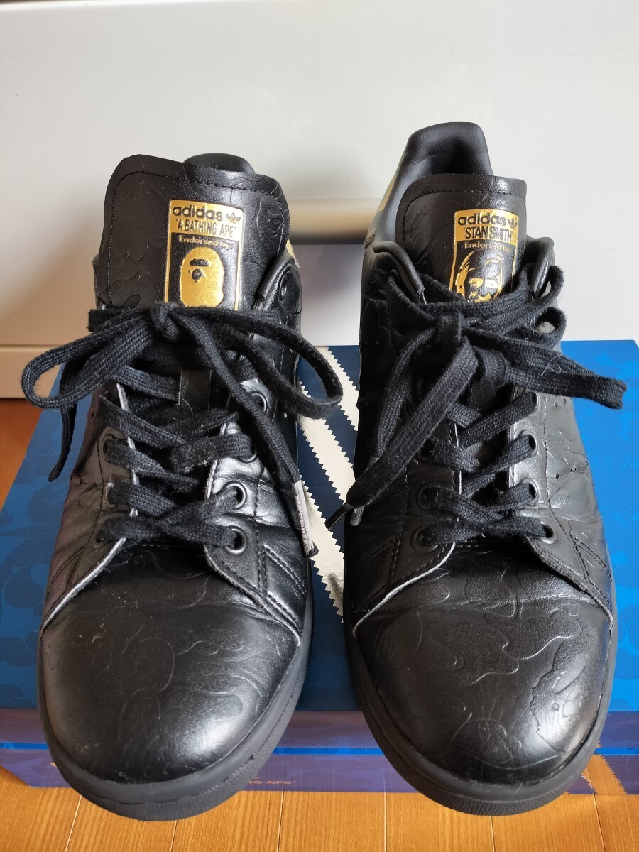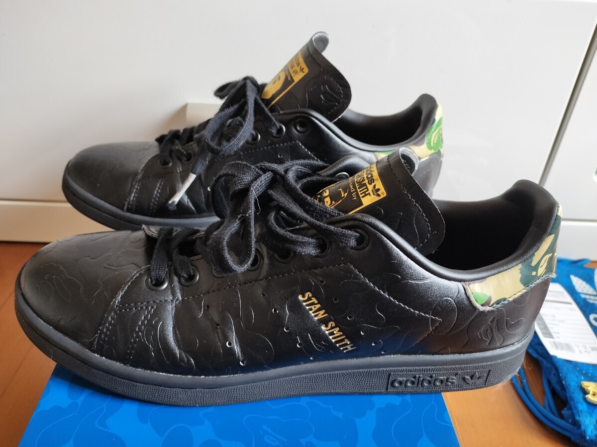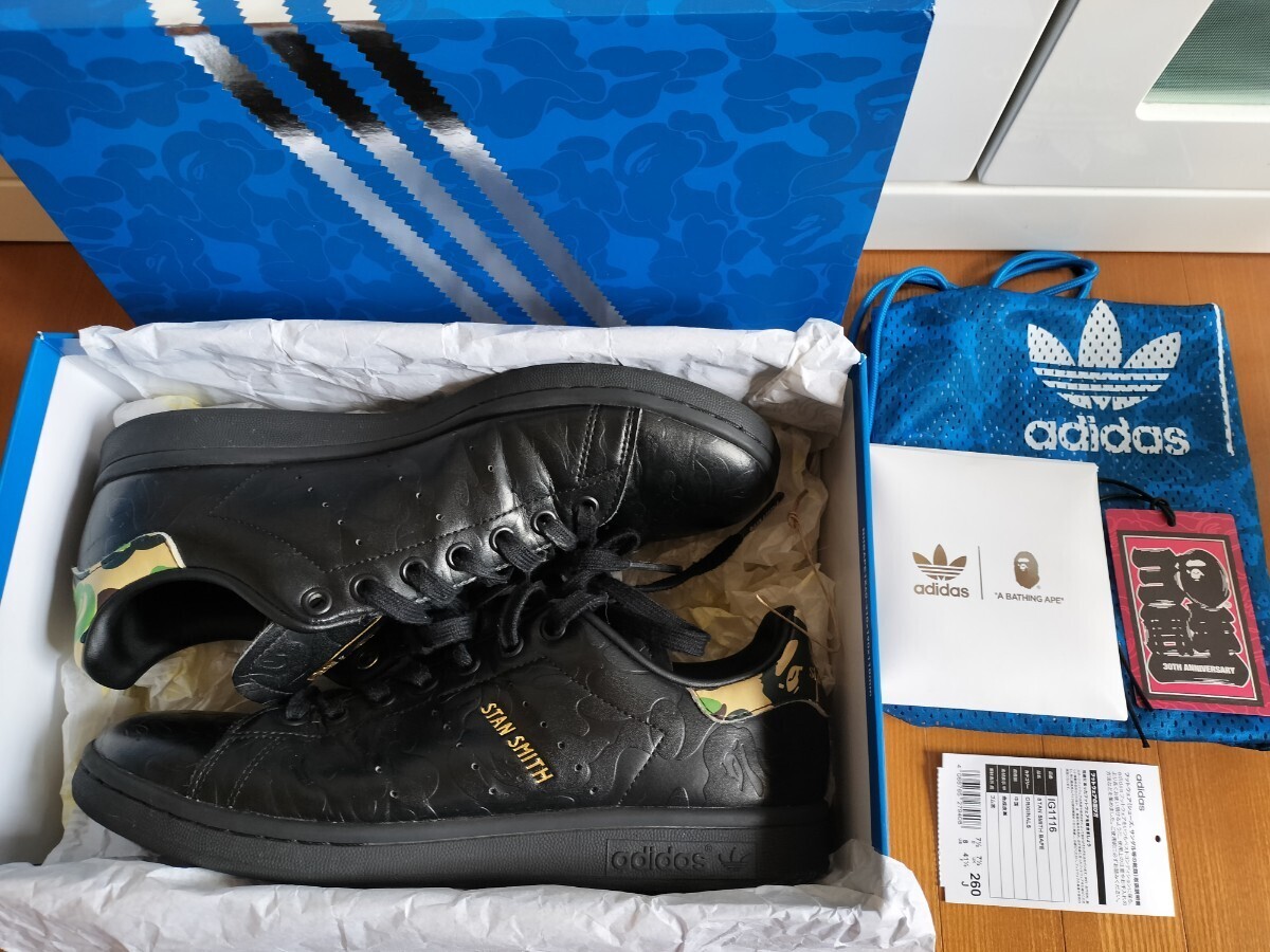 ヒールパッチとソックライナーカバーにはABC CAMOを配し、スタンスミスのシグネチャーである、シュータンのスタン・スミス氏の肖像は、右のみをエイプヘッドを金箔であしらい、このコラボレートを象徴しています。