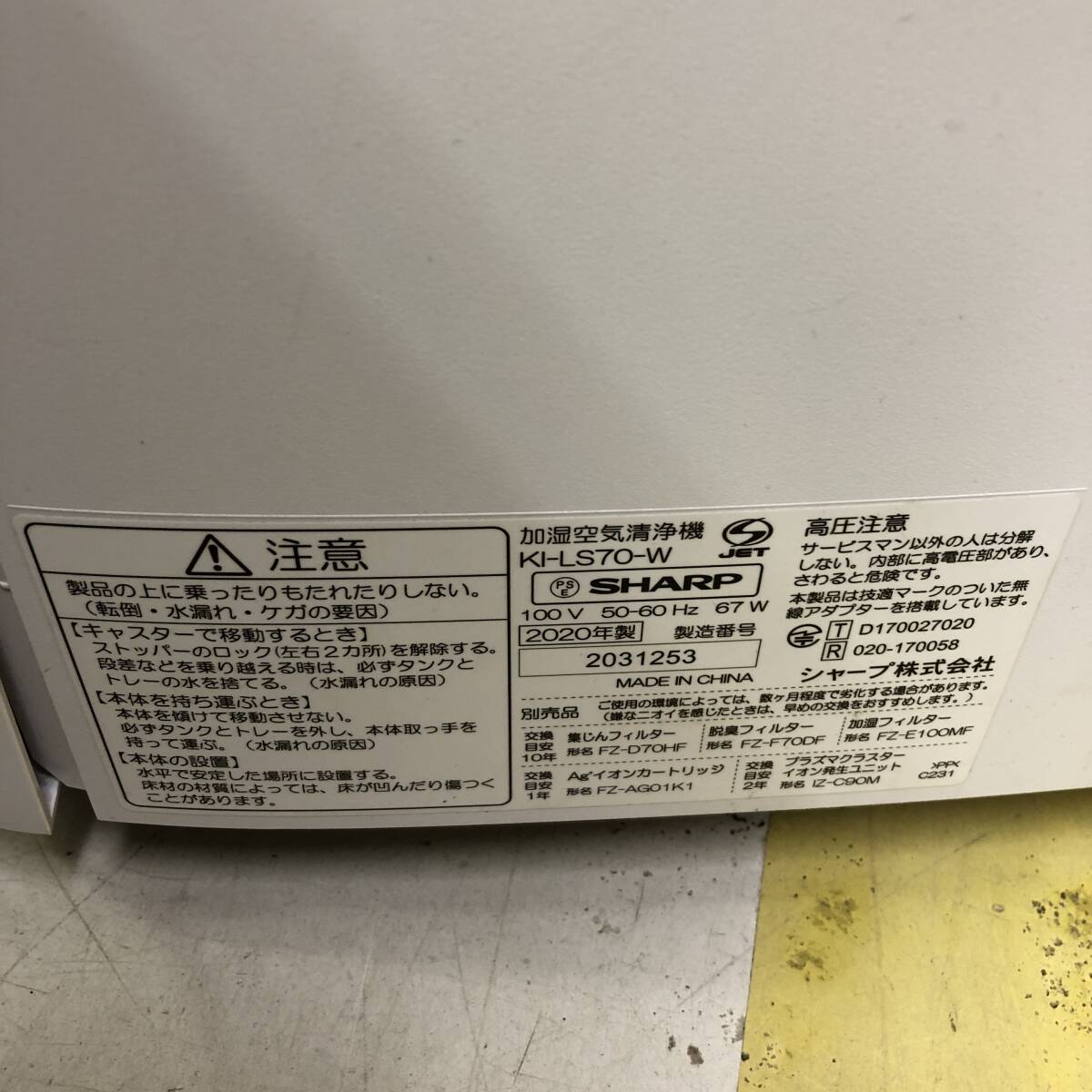 | 商品名 | sm029 送料無料!動作品 シャープ SHARP プラズマクラスター2500 加湿空気清浄機 KI-LS70-W 2020年製 |