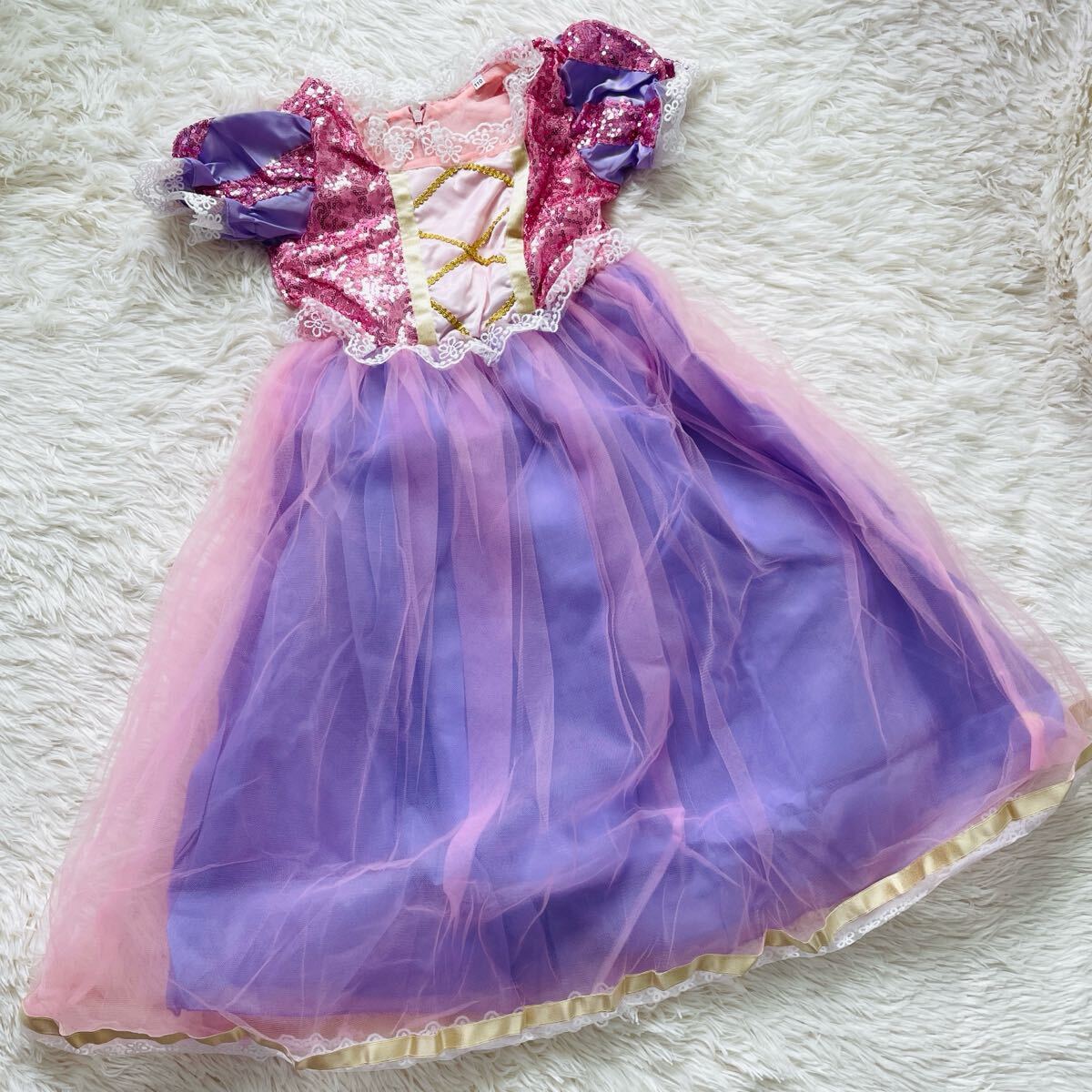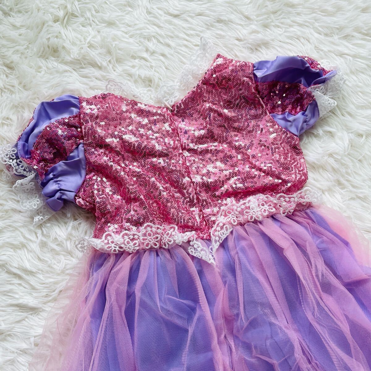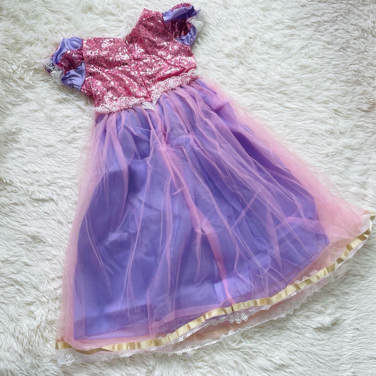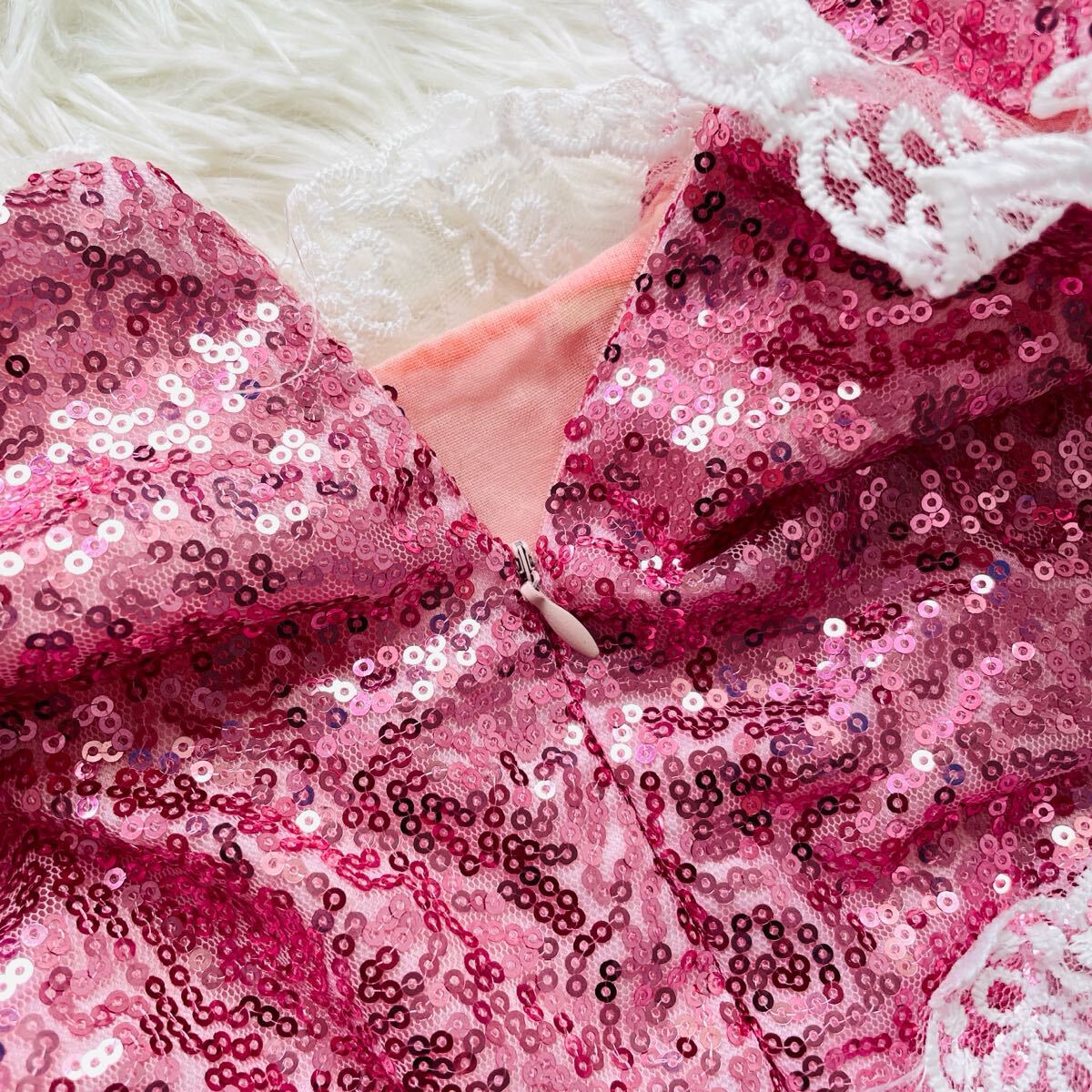 華やかなスパンコールが上半身を彩り、動くたびにきらめきを放つ存在感たっぷりのドレスです。