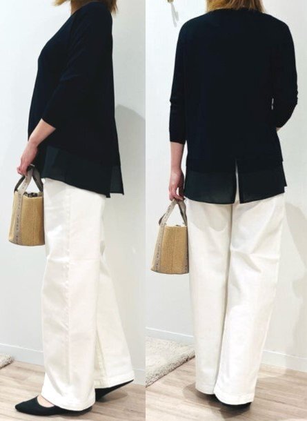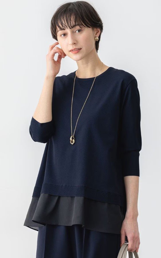 シャツ生地の裾揺れ感で体型カバーも叶えて一枚着映えするのがうれしいニットです。